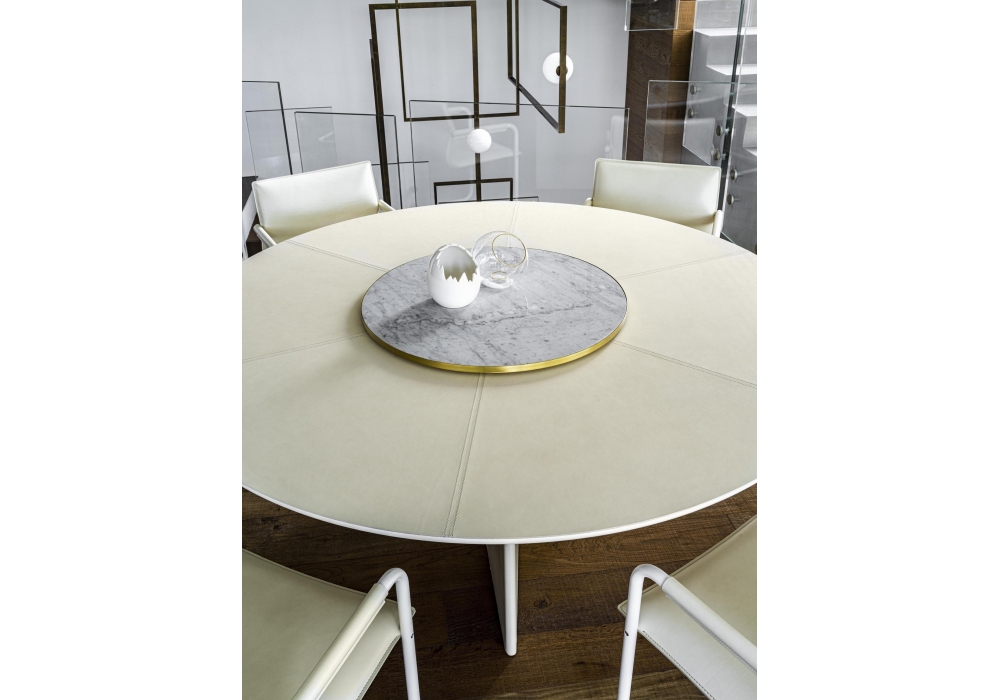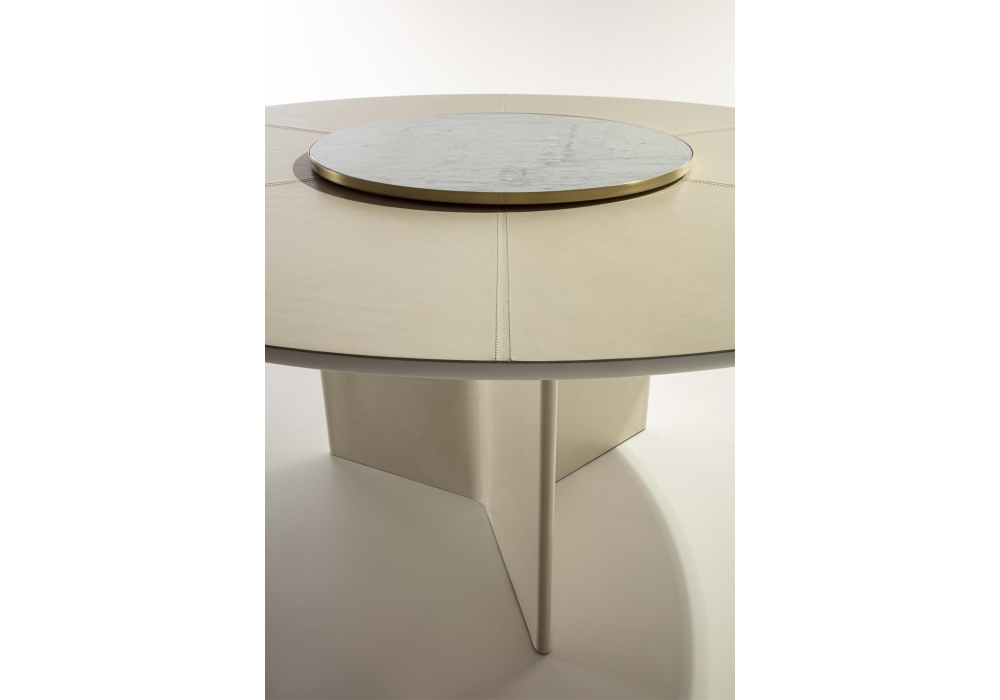 Star Lazy Susan von RedCreative für Enrico Pellizzoni entworfen, ist ein Tisch mit geformter zentraler Basis und Platte aus mit Leder überzogenem Holz, zentrales drehbares Regal aus Marmor. Erhältlich in verschiedenen Ausführungen und Größen.
