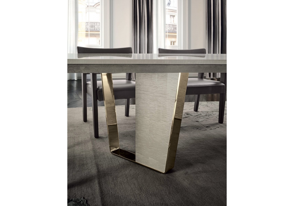 Keope von Giuseppe Viganò für Longhi entworfen, ist ein Tisch mit zwei trapezförmigen Beinen aus lasergeschnittenem, geschliffenem Metall mit lederbezogenen Einsätzen. Geformte und unterteilte Platte aus mehreren Materialien, aus Marmor und in 2 oder 3 Teile geteilt. Die Platte mit modularen Teilen in verschiedenen Ausführungen ist auf Anfrage erhältlich.