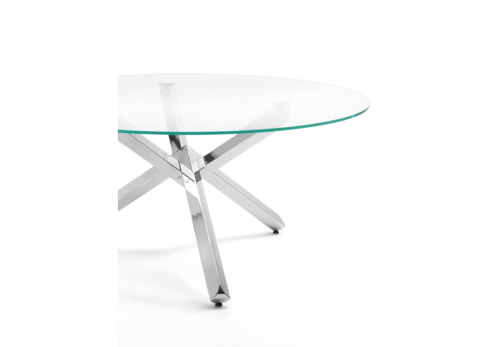 Verve von Giulio Manzoni für Enrico Pellizzoni entworfen, ist ein Tisch mit zentralem Fuß in zwei verfügbaren Modellen, die in poliertem, satiniertem, lackiertem oder mit Leder bezogenem Edelstahl ausgeführt sind. Transparente Glasplatte.