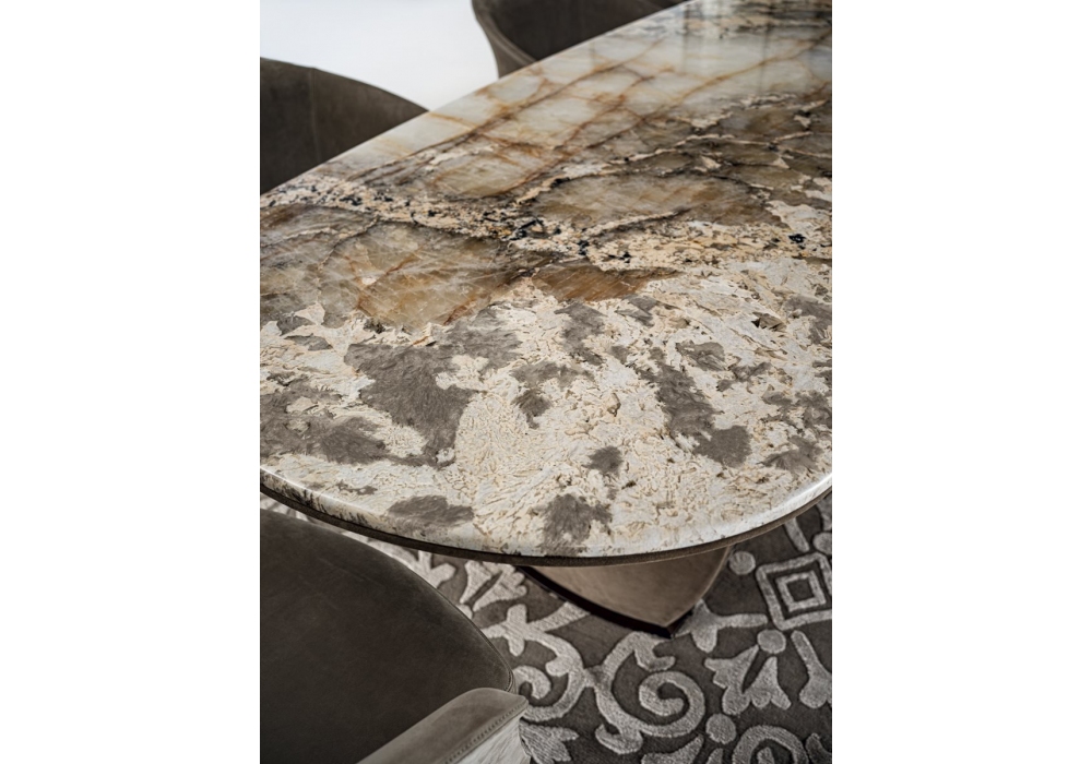 Lotus von Giuseppe Iasparra für Longhi entworfen, ist ein Tisch mit Beinen aus hochdichtem Formschaum und mit Leder mit glänzenden oder matten Metallteilen bezogen. Marmorplatte und Unterplatte aus Leder passend zu den Beinen. Auf Wunsch ist es möglich, „Marlène“ auf das Leder zu sticken, das das Bein bedeckt. Verfügbar in mehrerer Abmessungen.