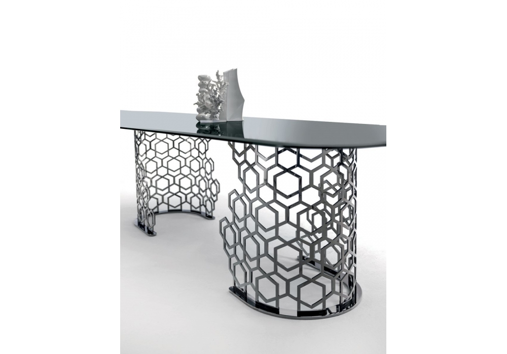 Manfred, von Giuseppe Iasparra für Longhi entworfen, ist ein Tisch mit Struktur aus lasergeschnittenem, geschliffenem Metall mit Sequenz und geschwungener Dekoration. Marmor- oder Kristallplatte. Verfügbar in mehrerer Abmessungen und Ausführungen.