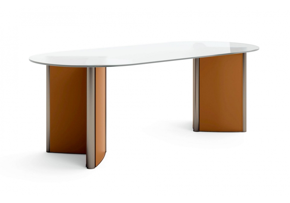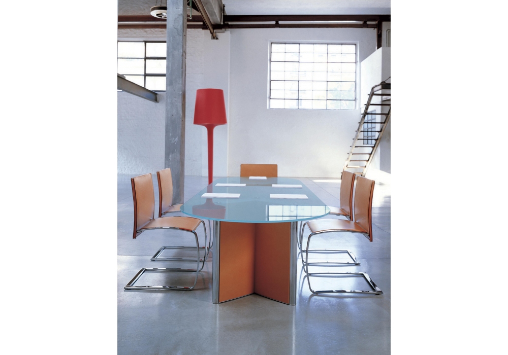 Valeo Meeting von G&R Fauciglietti für Enrico Pellizzoni entworfen, ist ein Tisch mit Beinen aus stranggepresstem Aluminium. Paneele mit Leder bezogen. Glasplatte. Erhältlich in verschiedenen Ausführungen und Modellen.