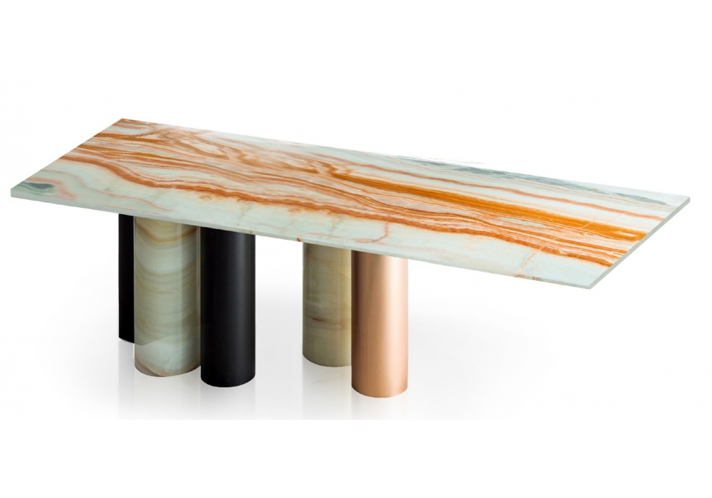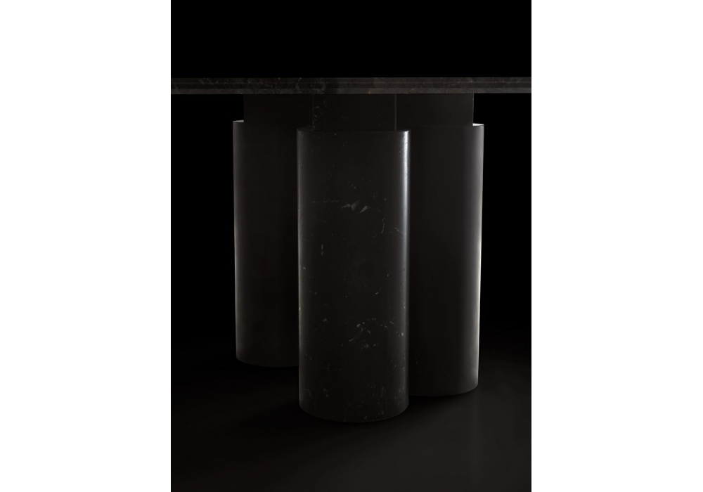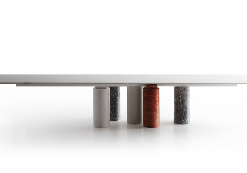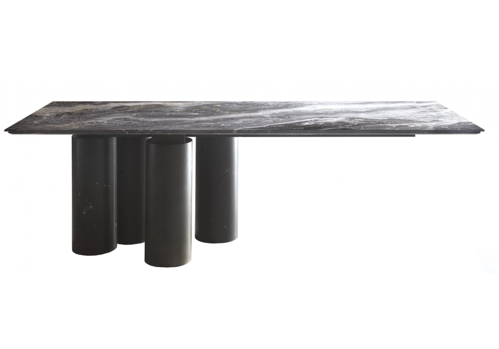 Arcaico von Enzo Berti für Kreoo entworfen, ist ein Tisch mit runder oder rechteckiger Platte aus Marmor oder Holzfurnier. Der aus Zylindern bestehende Sockel besteht aus Marmor oder Metall. Verfügabr in mehreren Abmessungen.