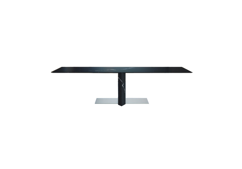 Kalende von Enzo Berti für Kreoo entworfen, ist ein Tisch mit Metallbasis und Struktur aus Marmor. Ein Marmorelement, das die Platte trägt, ruht senkrecht auf der Basis.