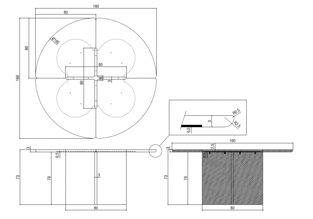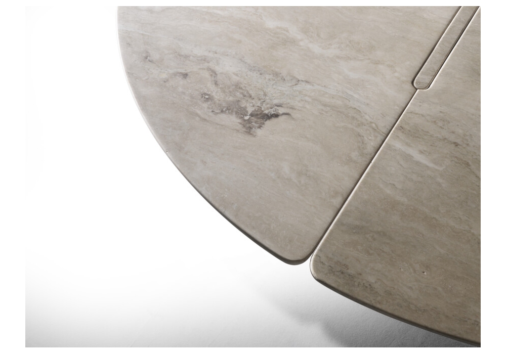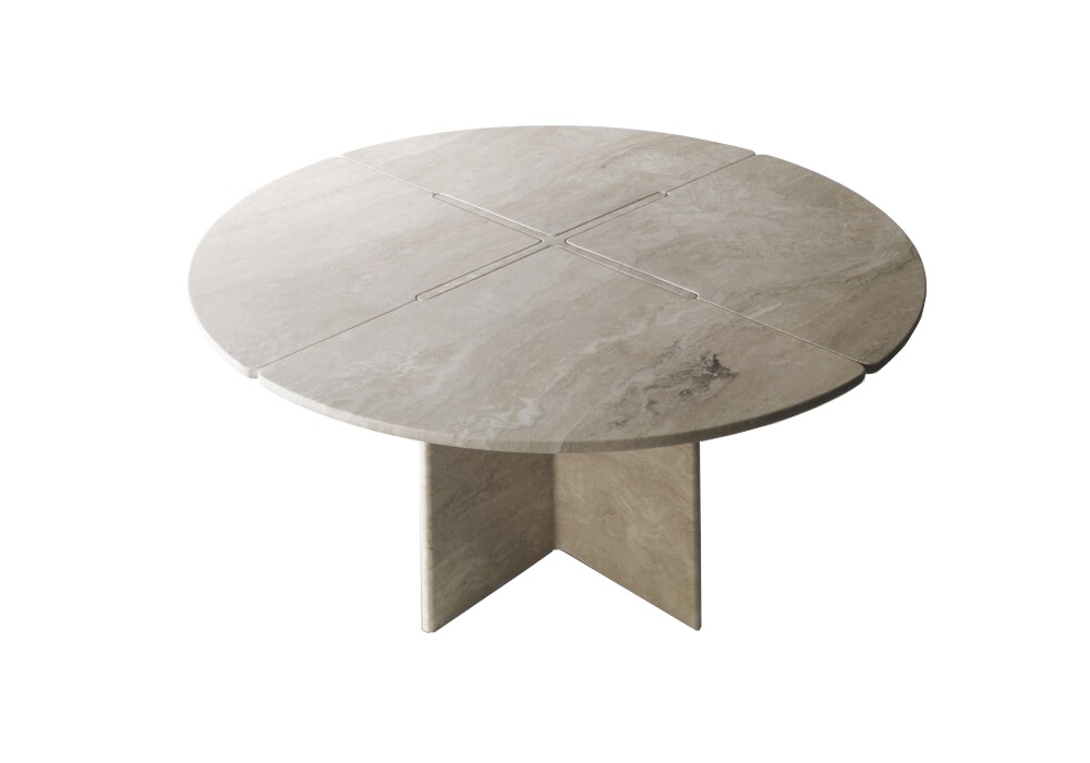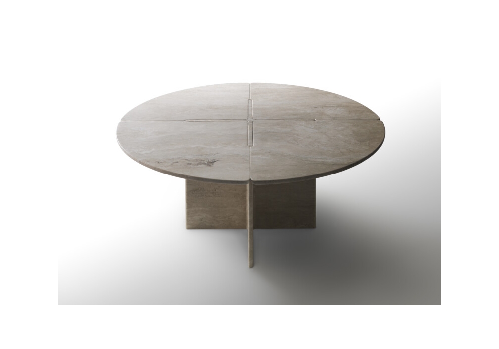 More von Marco Spatti für Kreoo entworfen, ist ein runder Tisch aus Marmor. Verfügbar in der Version mit oder ohne zentrales Kreuzdetail aus Metall.
