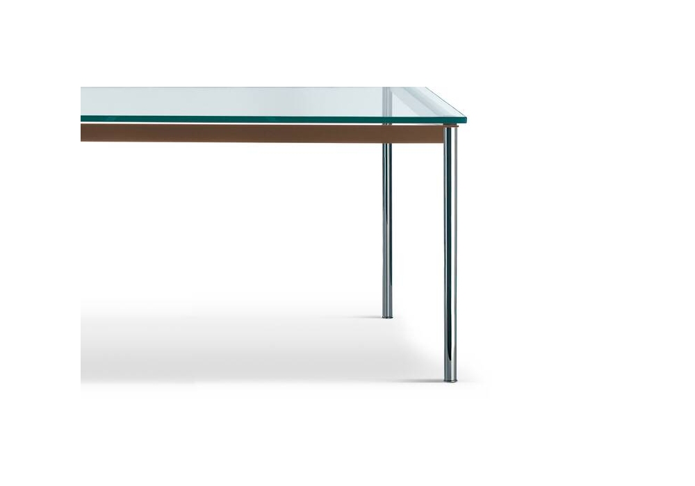 10 Table en Tube von Le Corbusier, Pierre Jeanneret, Charlotte Perriand für Cassina entworfen, ist ein quadratischer Tisch mit Kristall-, geformter oder farbiger Glasplatte und verchromten Beinen mit lackierter Struktur. Verfügbar in mehreren Ausführungen.