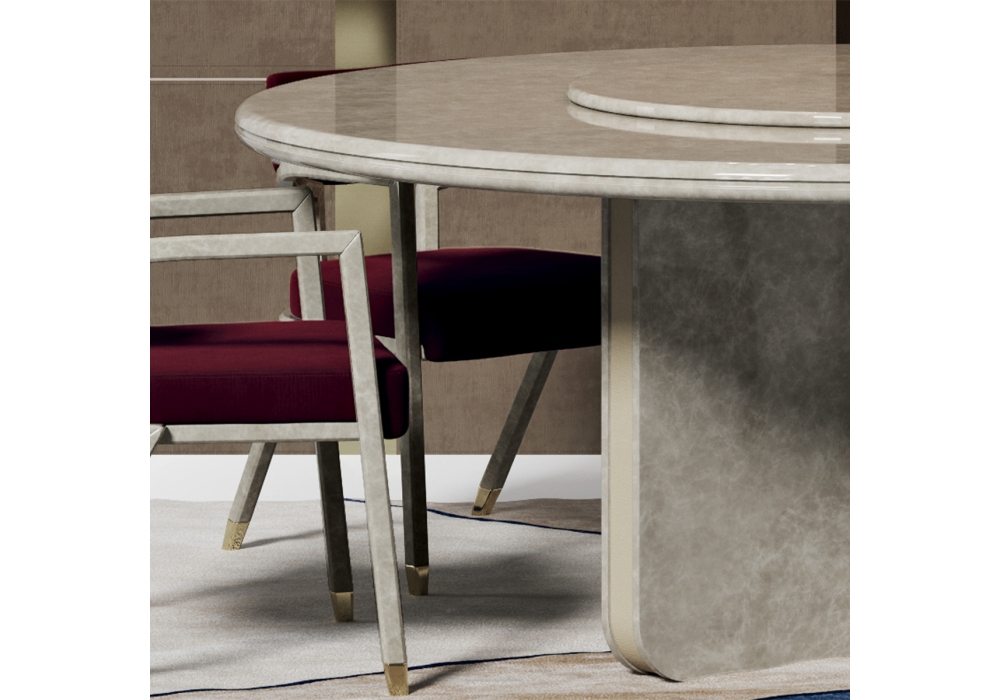 Madison von Andrea Bonini für Turri entworfen, ist ein runder Tisch mit Struktur aus MDF und Sperrholz mit handverzierter glänzender Polyesteroberfläche. Die dreisegelige Basis ist mit Ledereinsätzen und einem zentralen goldenen Metalldetail verziert. Verfügbar in mehreren Abmessungen.