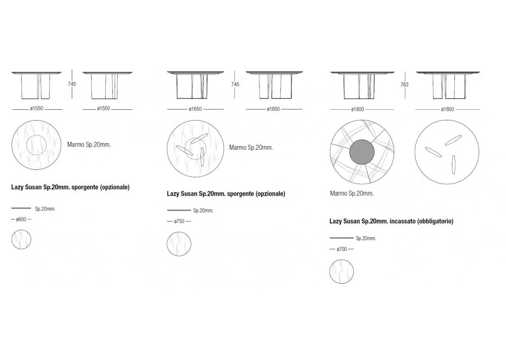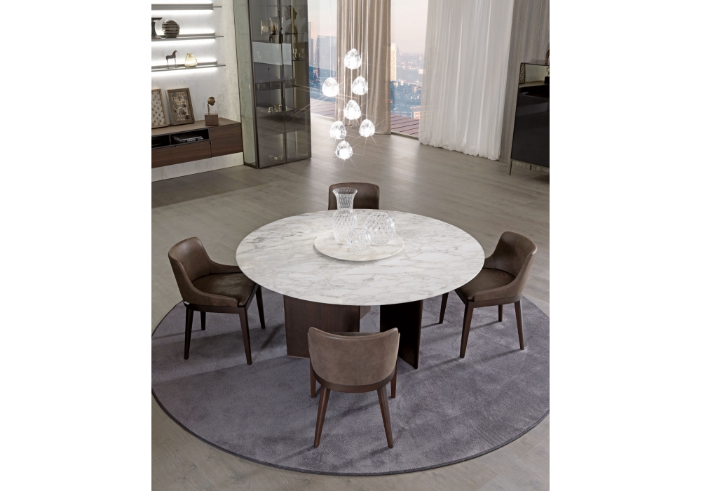 Ala Round von Ferruccio Laviani für MisuraEmme entworfen, ist eine Serie von Tischen mit Holzsockel in Essence, matt lackiert oder Antik-Mattlack. Runde Platte aus Marmor mit lackierter Unterplatte. Für die runde Platte mit 155 cm und 165 cm Durchmesser gibt es die Möglichkeit, eine drehbare geformte Marmorplatte (Lazy Susan) auf der mittleren Platte zu ruhen; für die anderen Abmessungen ist die eingebaute drehbare Platte, die immer obligatorisch ist, in Marmor, matt lackiert oder antik matt lackiert.