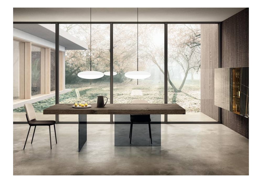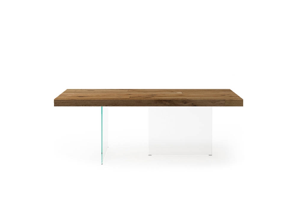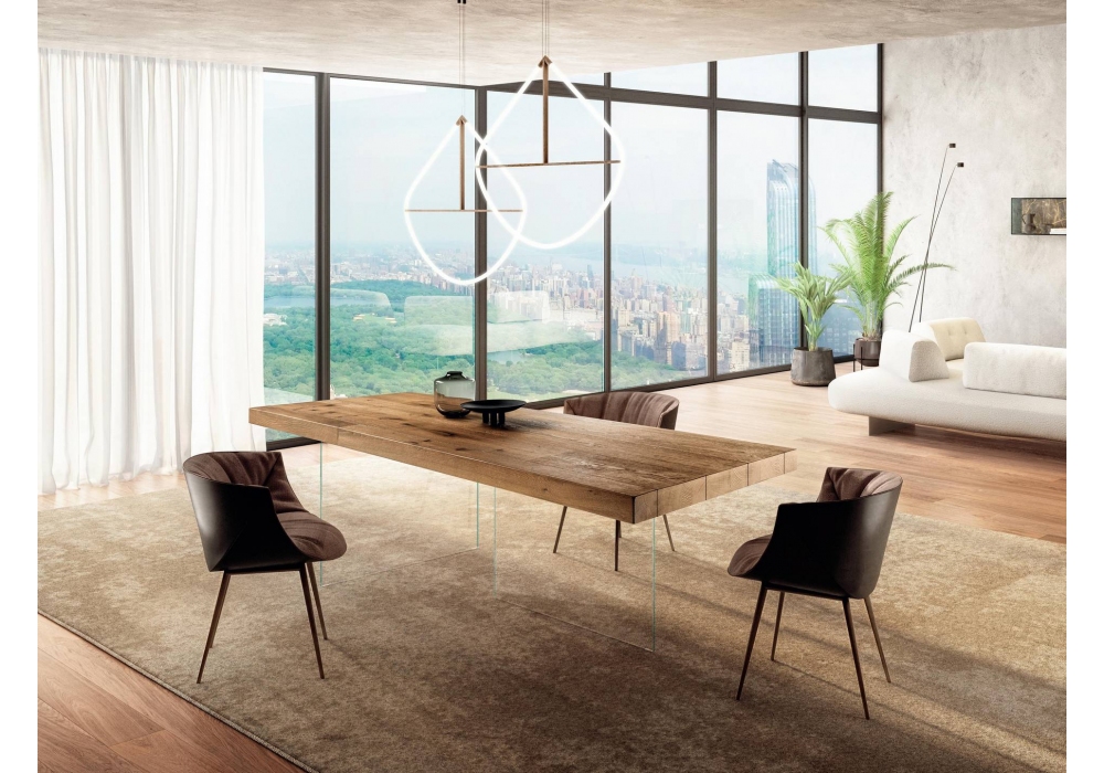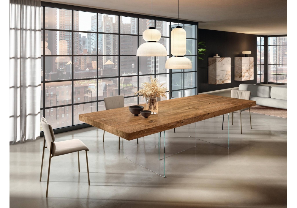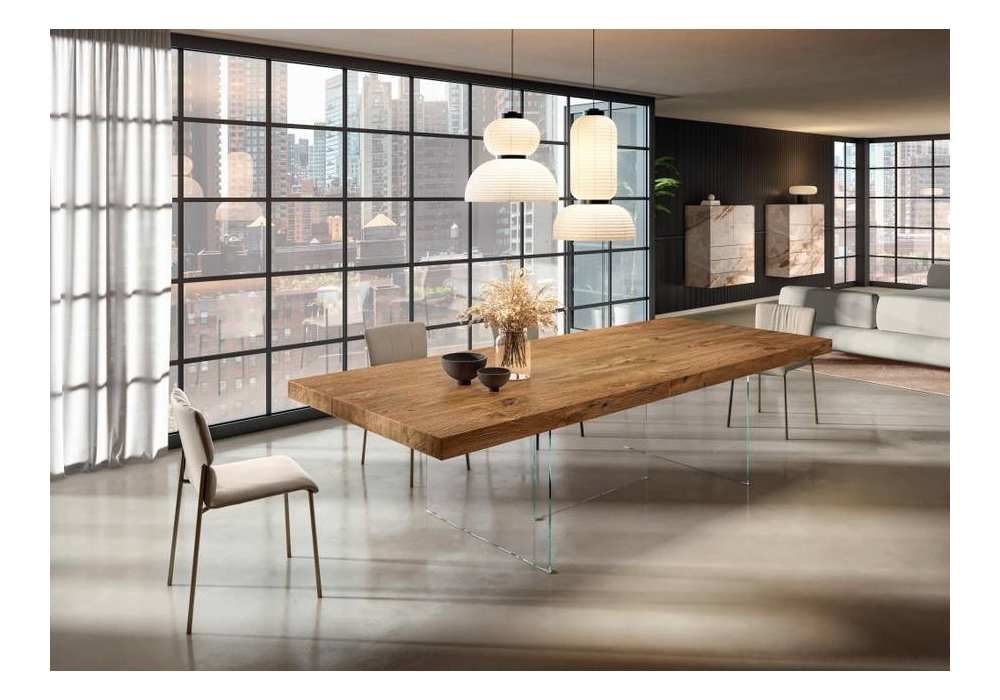 Air Wildwood von Daniele Lago für Lago entworfen, ist ein Tisch mit Beinen aus extraklarem oder rauchgrauem Glas und Tischplatte aus Wildwood. Verfügbar in mehreren Ausführungen und Abmessungen.