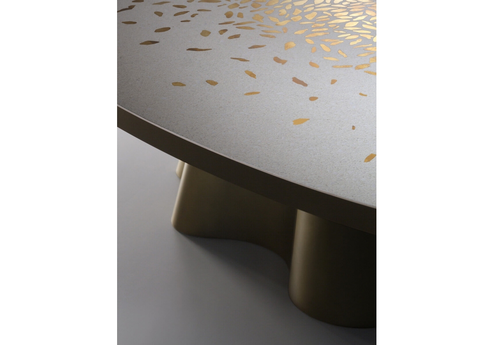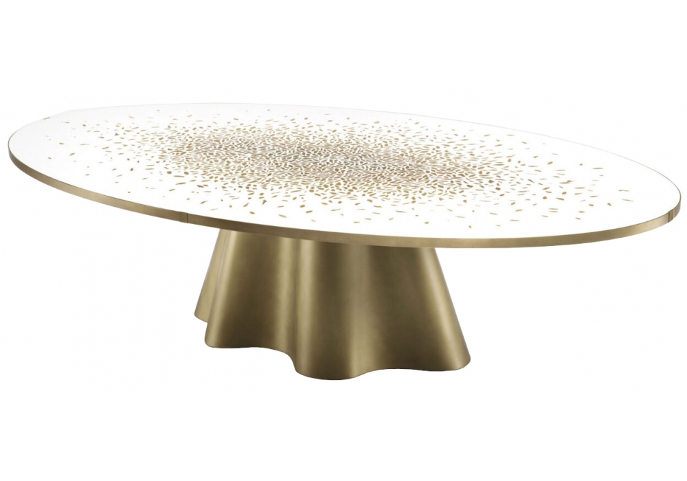 Vela von R&D De Castelli für DeCastelli entworfen, ist ein Tisch mit einer ovalen Platte aus weißem venezianischem Seminato-Marmor mit Messingeinsätzen und einer skulpturalen Basis, die vollständig aus Messing besteht.