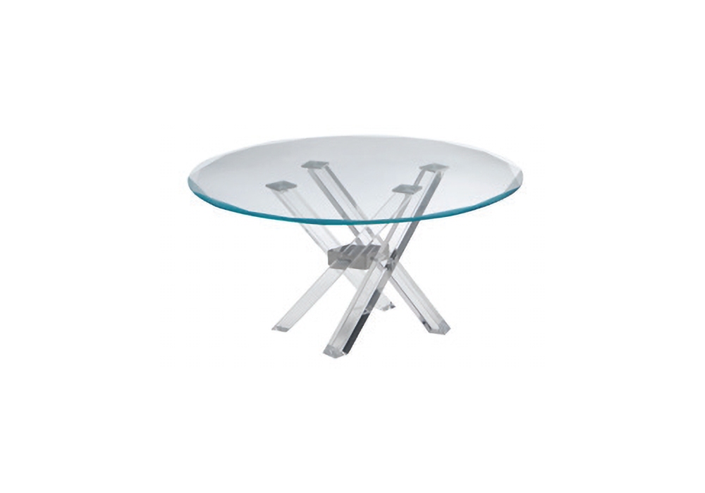 Shangai Limited Edition von Riflessi entworfen, ist ein runder Tisch mit transparentem Methacrylat-Fuß, der aus geneigten und asymmetrisch überlappenden Beinen mit zentralem Gelenk aus Edelstahl besteht. Die Oberseite besteht aus extra klarem, transparentem, gehärtetem Glas mit abgeschrägter Vorder- und Rückseite. Verfügbar in zwei Dimensionen.