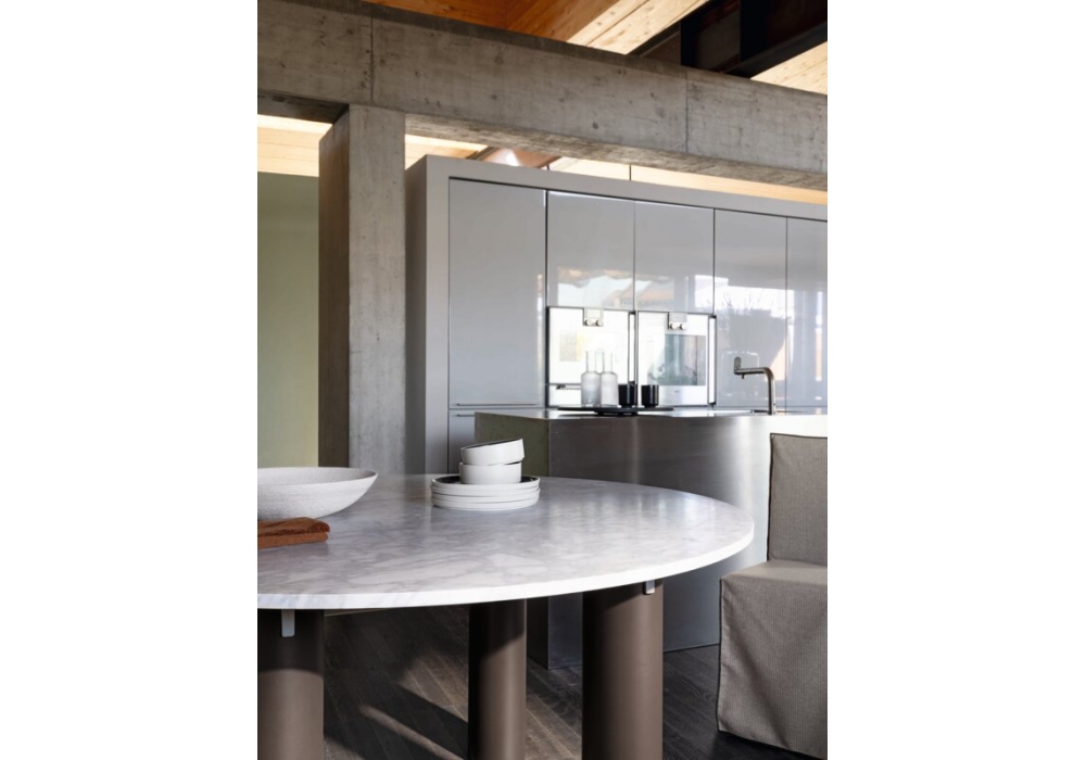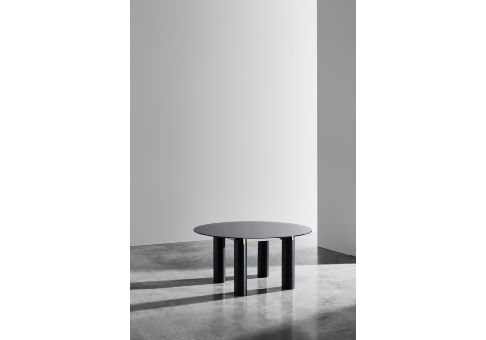 Daen 36 von Federico Peri für Gervasoni entworfen, ist ein runder Tisch mit fester Platte. Beine aus lackiertem MDF und Rahmen aus glänzend lackiertem Stahl. Platte aus Feinsteinzeug gepaart mit bronzefarbenem Glas, lackiertem Glas darunter oder aus weißem Carrara-Marmor. Verfügbar in mehreren Ausführungen.
