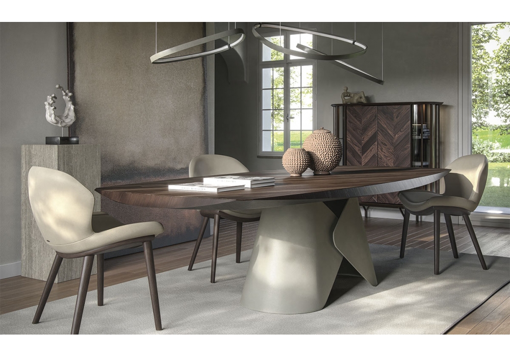 Scott Wood von Studio 28 & P. Cattelan für Cattelan Italia entworfen, ist ein Tisch mit Sockel aus lackiertem Stahl oder Oxybrass, tonnenförmiger Platte mit abgeschrägten Kanten aus Canaletto-Walnuss oder gebrannter Eiche („B“-Version), geformter Platte aus Canaletto-Walnuss oder Eiche gebrannt, hergestellt aus unterschiedlichen, diagonal angeordneten Streifen (Version „Masterwood“). Schräge und abgerundete Kanten. Erhältlich in verschiedenen Ausführungen und Größen.