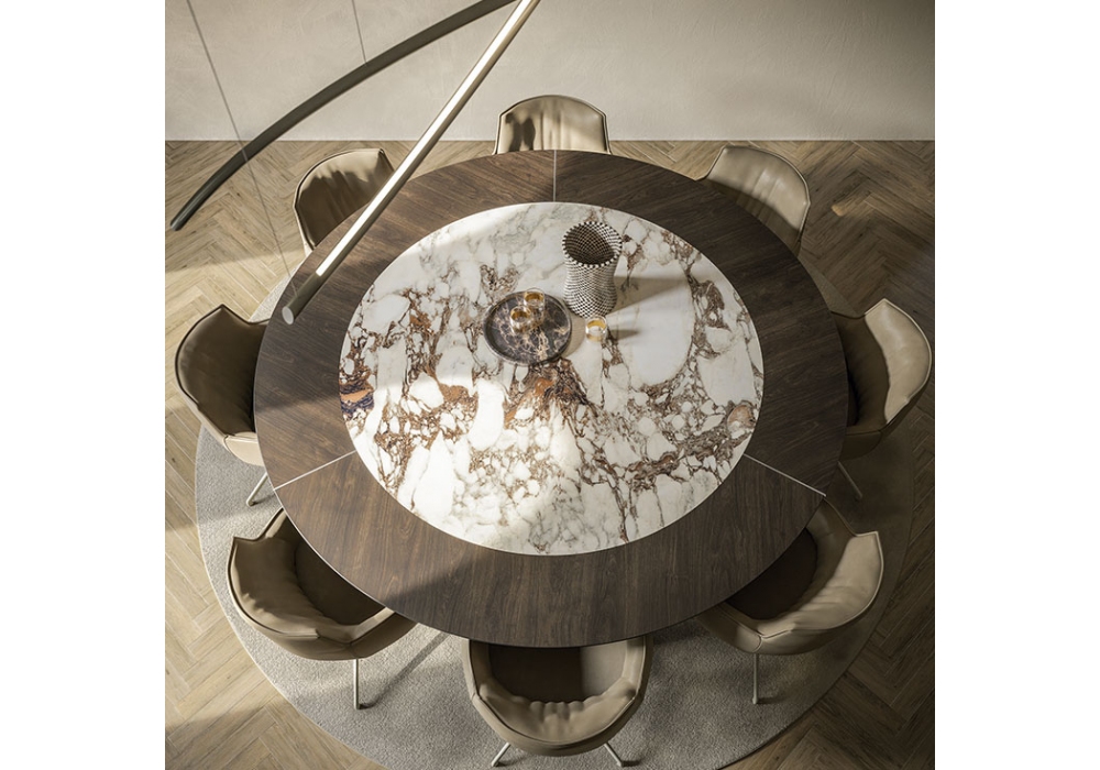 Senator Ker-Wood Round von Paolo Cattelan für Cattelan Italia entworfen, ist ein Tisch mit einem Gestell aus Titan oder bronzegeprägtem Stahl, einer Platte aus Nussbaum Canaletto oder gebrannter Eiche und einem Einsatz aus Marmi-Keramik in verschiedenen Ausführungen. Details in Schwarzchrom. Erhältlich in verschiedenen Größen und in der „T“-Version mit drehbarem Keramikeinsatz.