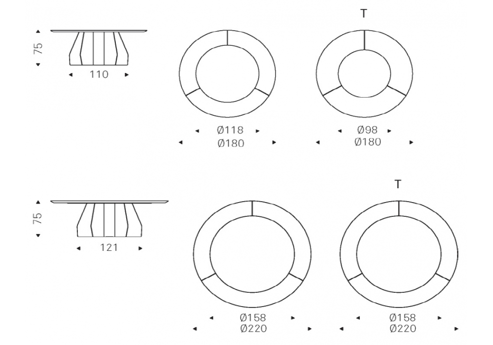 | Abmessungen | • Ø 180 x H 75 cm; • Ø 220 x H 75 cm; • Ø 180 x H 75 cm (T); • Ø 220 x H 75 cm (T) |