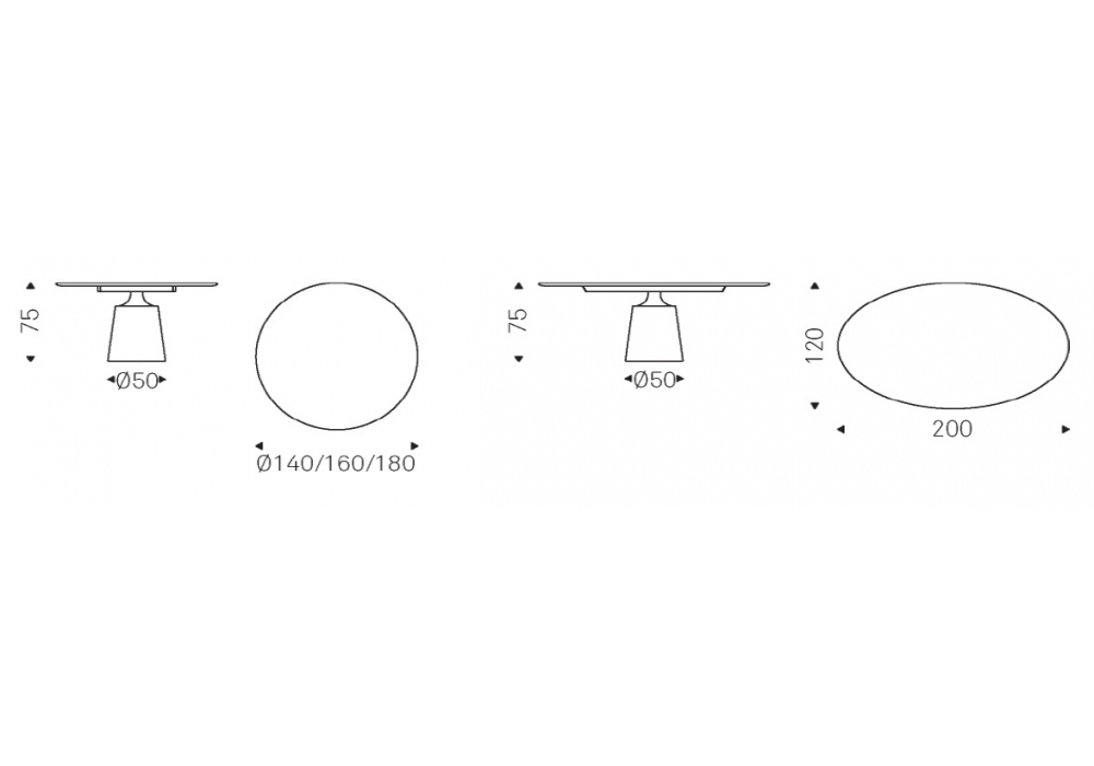 | Abmessungen | • Ø 140 x H 75 cm; • Ø 160 x H 75 cm; • Ø 180 x H 75 cm; • 200 x 120 x H 75 cm (ovale) |