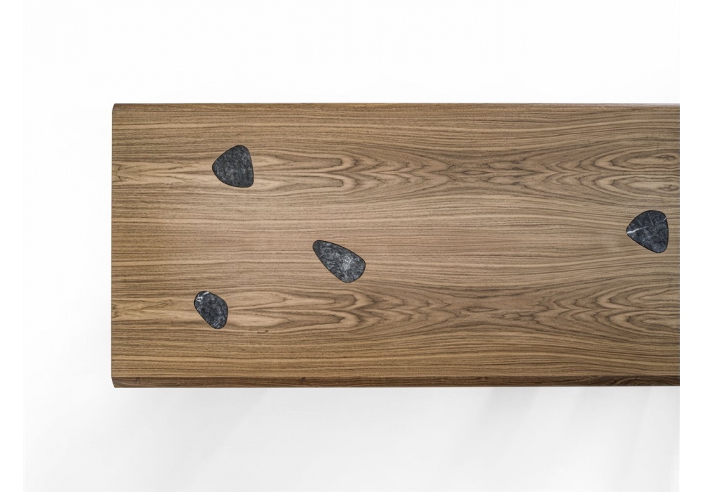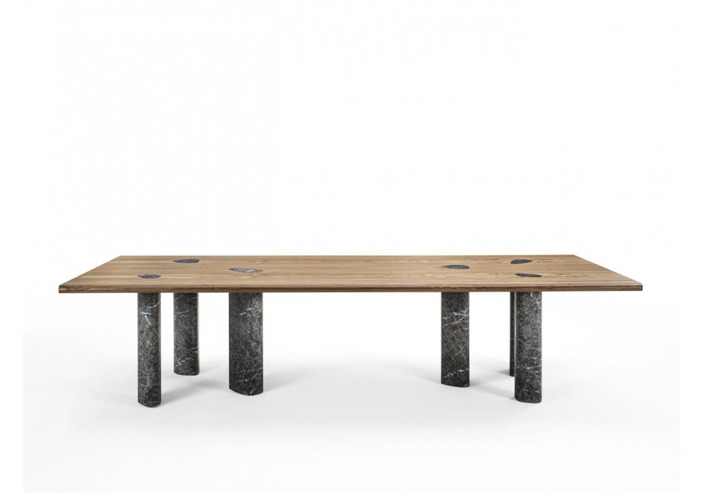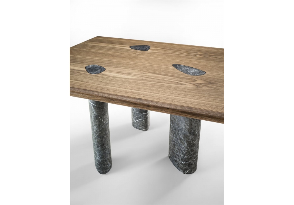 Osmose von Patrick Jouin für Porada entworfen, ist ein Esstisch mit Platte aus Canaletta-Walnuss, geformter Kante aus Massivholz und Marmorbeinen. Auf der Oberseite befinden sich Marmoreinsätze in der gleichen Ausführung wie die Beine, die mit den Beinen selbst korrespondieren. Verfügbar in mehreren Abmessungen.