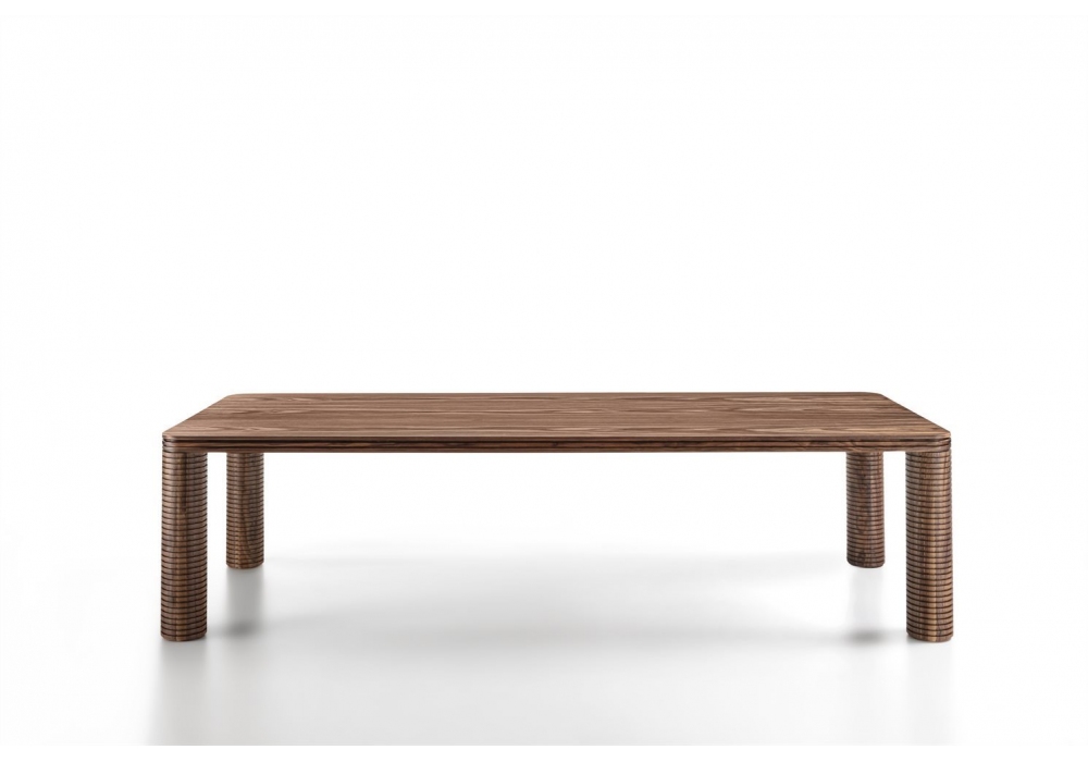 Sansiro L von Meneghello Paolelli für Porada entworfen, ist ein rechteckiger Esstisch mit abgerundeten Ecken, Struktur aus massivem Canaletta-Walnussholz, Holzplatte und gedrechselten Beinen aus vier Massivholz. Die Beine weisen Anzeichen einer Verbindung in der Nähe der Verbindung zwischen den Blöcken auf.