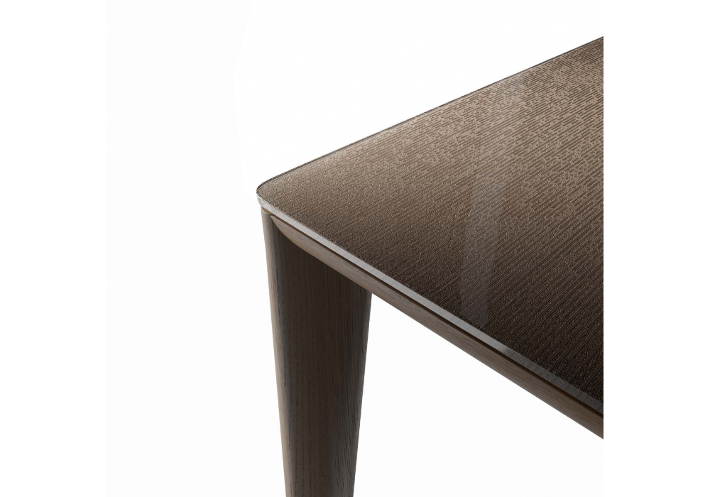 Flaminio von Studio Klass für Fiam entworfen, ist ein Tisch mit einer Platte aus geschmolzenem und gehärtetem Glas und einer mit Metallic-Farben lackierten Rückseite. Struktur aus Massivholz, erhältlich in den wärmebehandelten Ausführungen Tabak oder Schwarz.