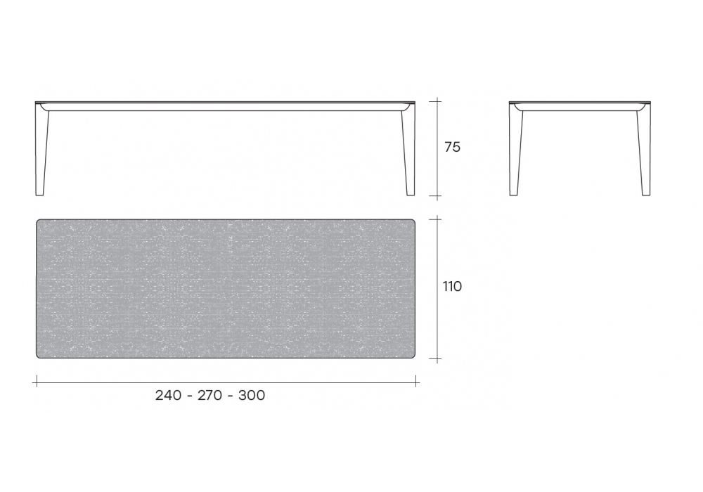 | Abmessungen | 240 x 110 x H 75 cm; 270 x 110 x H 75 cm; 300 x 110 x H 75 cm. |
