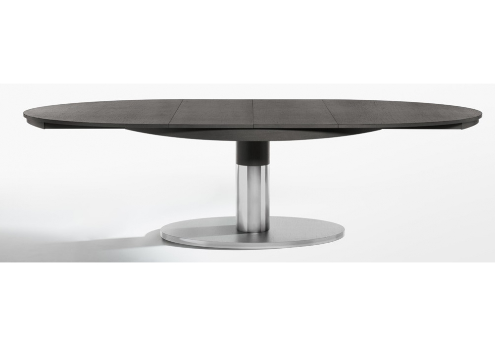 Diva von Alexander Lorenz für Potocco entworfen, ist ein ausziehbarer Tisch mit Untergestell aus lackiertem Metall oder poliertem Edelstahl und Platte und Gestell aus Eichenholz in verschiedenen Ausführungen. Verfügbar in zwei Dimensionen.