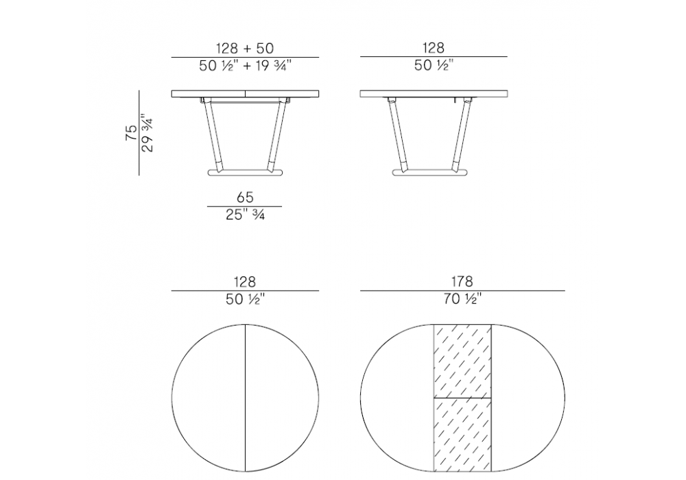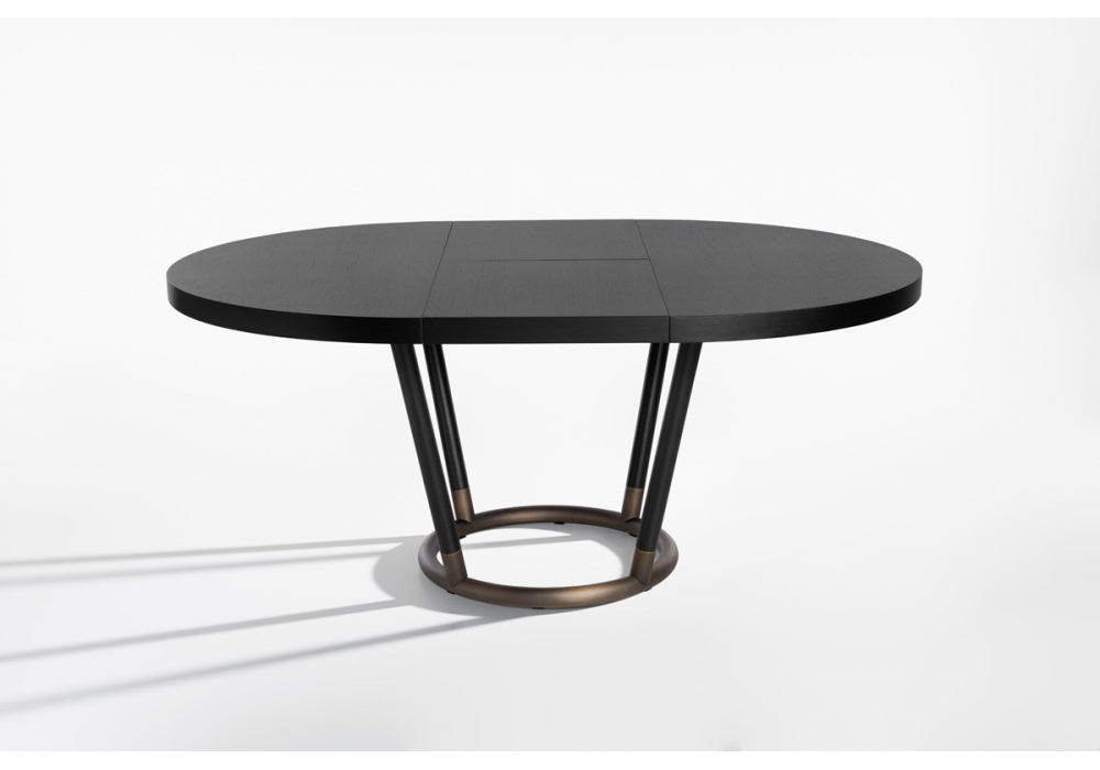 Pipe von Favaretto & Partners für Potocco entworfen, ist ein runder ausziehbarer Tisch komplett aus massiver Esche in verschiedenen Ausführungen. Rohrsockel aus brüniertem Messing.