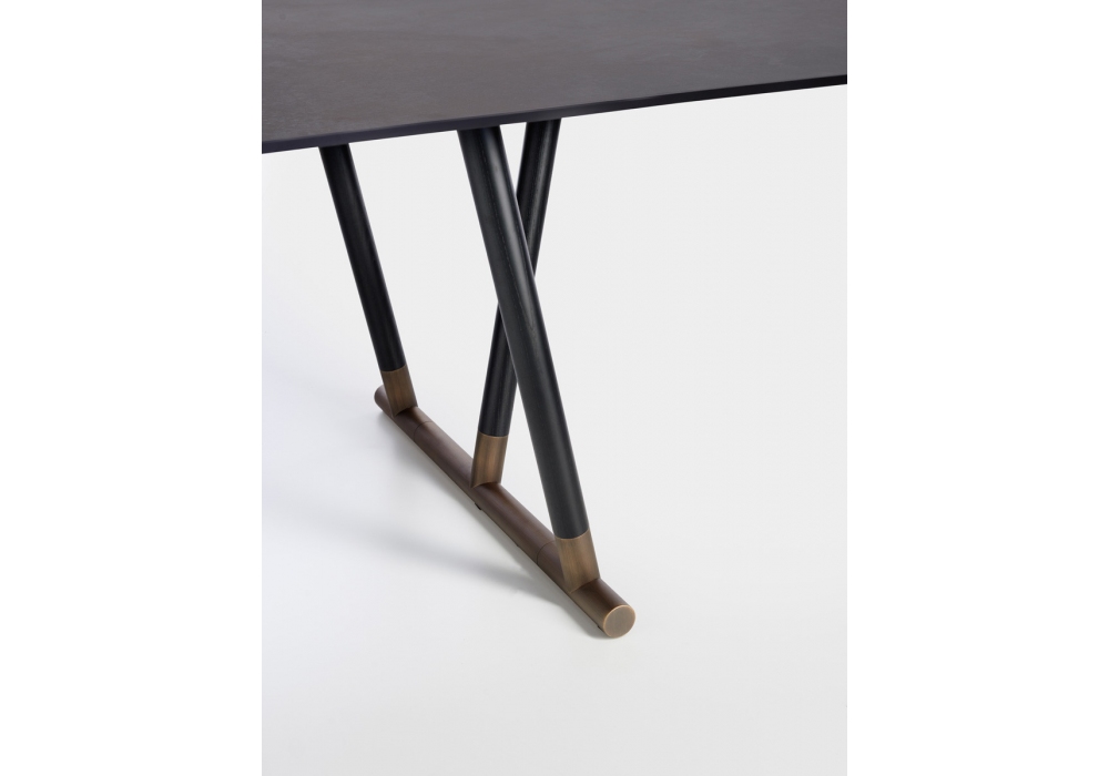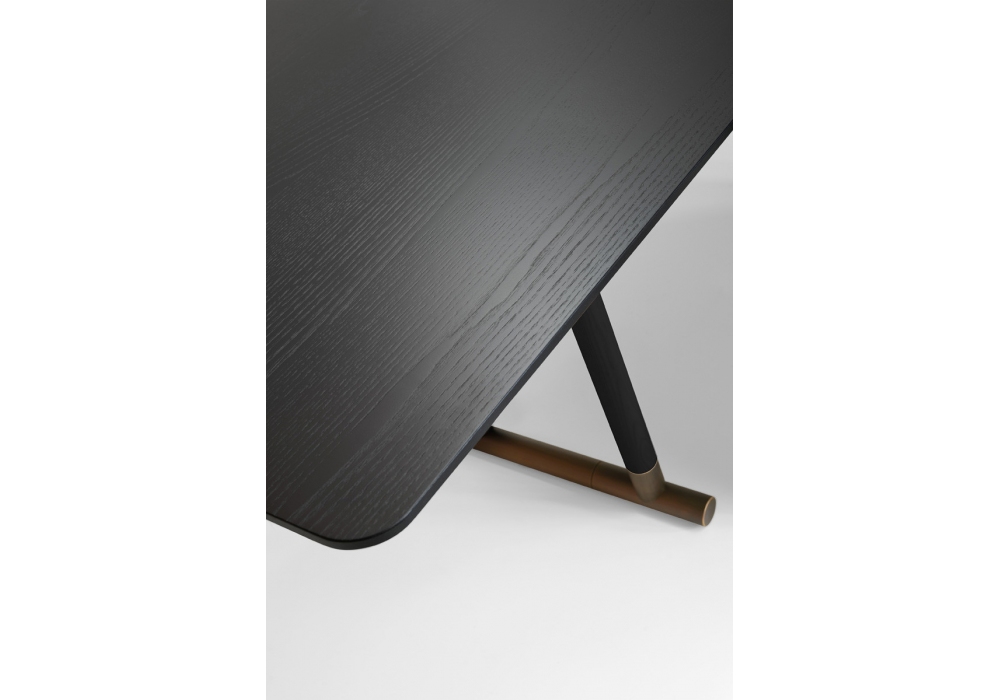 Pipe von Favaretto & Partners für Potocco entworfen, ist ein rechteckiger Tisch mit Sockel und zwei umgekehrten Böcken aus Esche und Metall mit brüniertem Messingfinish. Die Platte besteht aus Esche, Feinsteinzeug oder Marmor mit geringer Dicke und ist an den Ecken abgerundet.