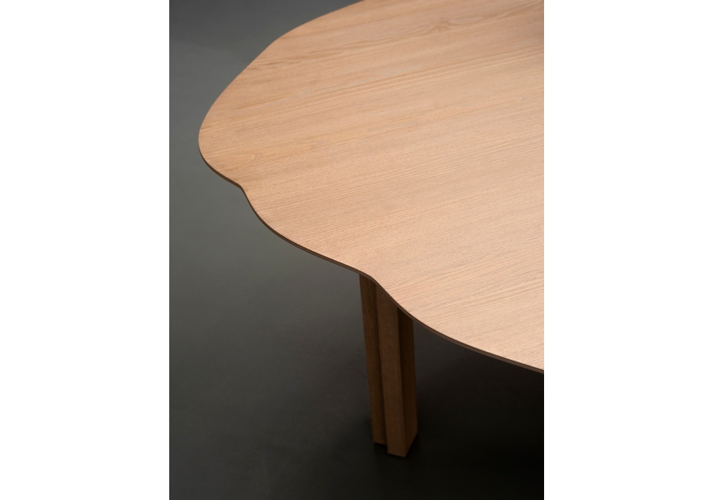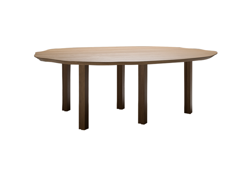 Parker, von Lorenzo Bini für Tacchini entworfen, ist ein Tisch aus grauer oder natürlicher Eiche, der von 5 Beinen getragen wird, die durch die Kombination leicht versetzter Streifen aus demselben Holz entstehen.