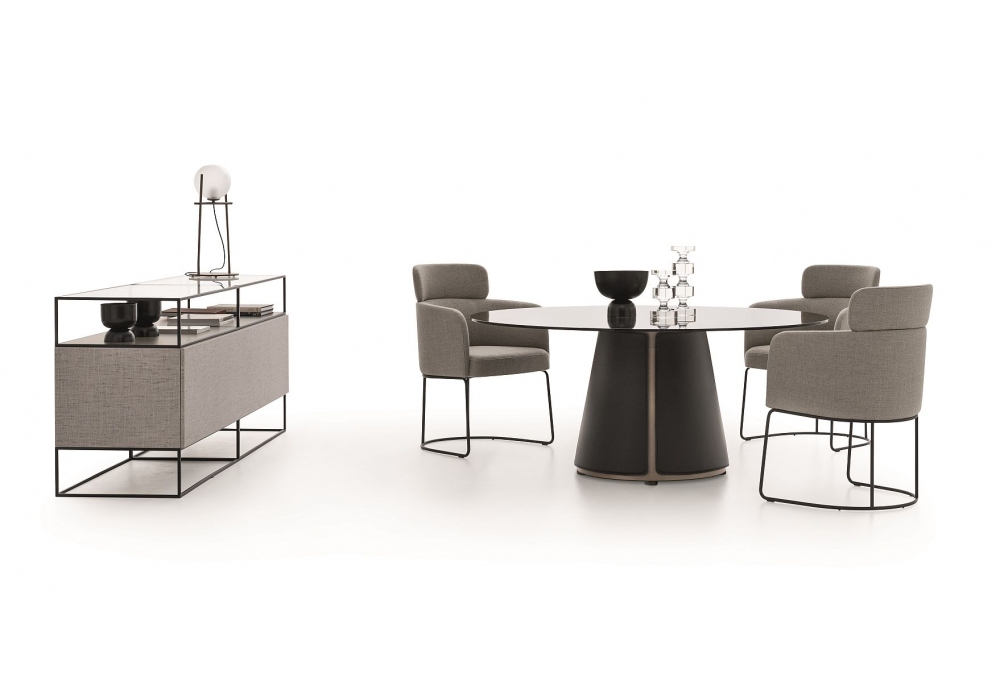 Claire von Daniele Lo Scalzo Moscheri für Ditre Italia entworfen, ist ein Tisch mit hellbrauner Stahlkegelstruktur, Kegelbezug aus Leder, Glasplatte und Metallfüßen. Erhältlich in verschiedenen Ausführungen und Größen.