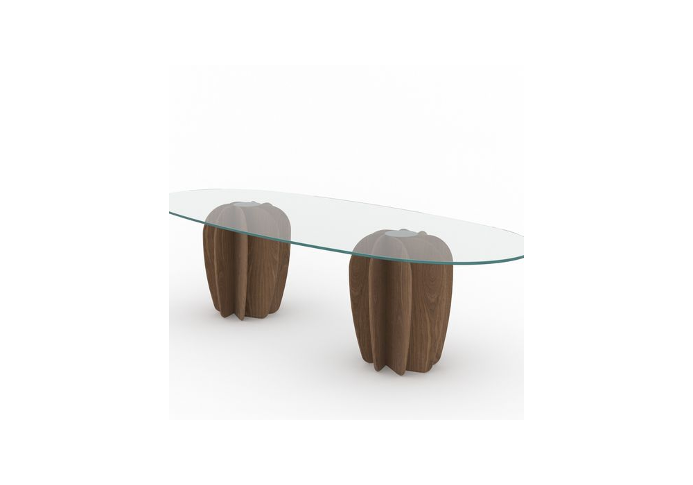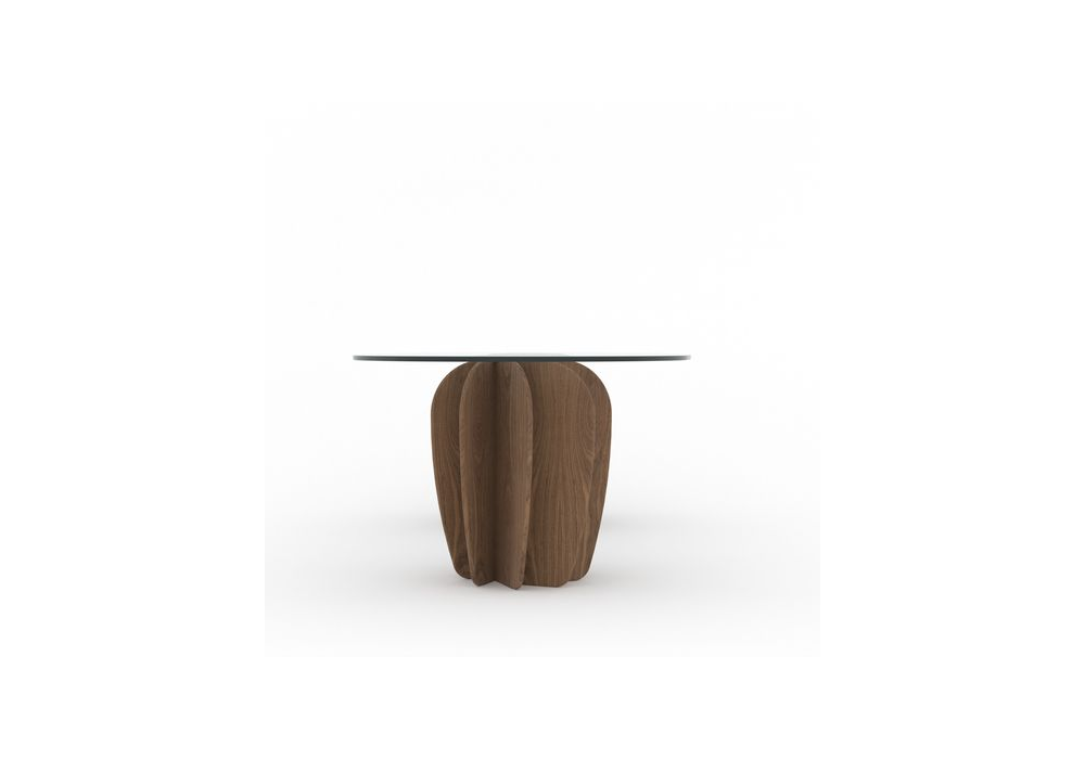 Coral von Arik Levy für Punt entworfen, ist ein Tisch mit einer Struktur aus walnussfurniertem MDF und einer Platte aus transparentem gehärtetem Glas, Dekton oder Walnuss.