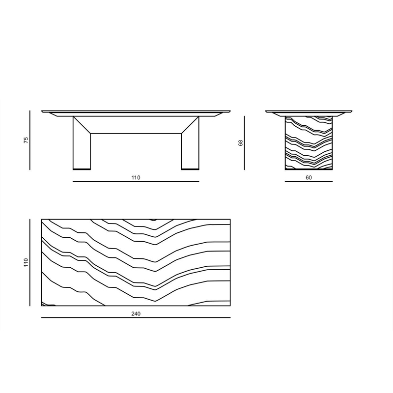 Kerwan Marble von Alessandro La Spada für Visionnaire entworfen ist ein viereckiger Tisch mit einer an den Seiten und im unteren Mittelteil gebogenen Edelstahlbasis. Die Tischplatte besteht aus einer Marmorplatte mit negativ abgeschrägter Kante und einer Unterplatte aus lackiertem Holz. Kerwan Marble ist in verschiedenen Modellen und Ausführungen erhältlich.