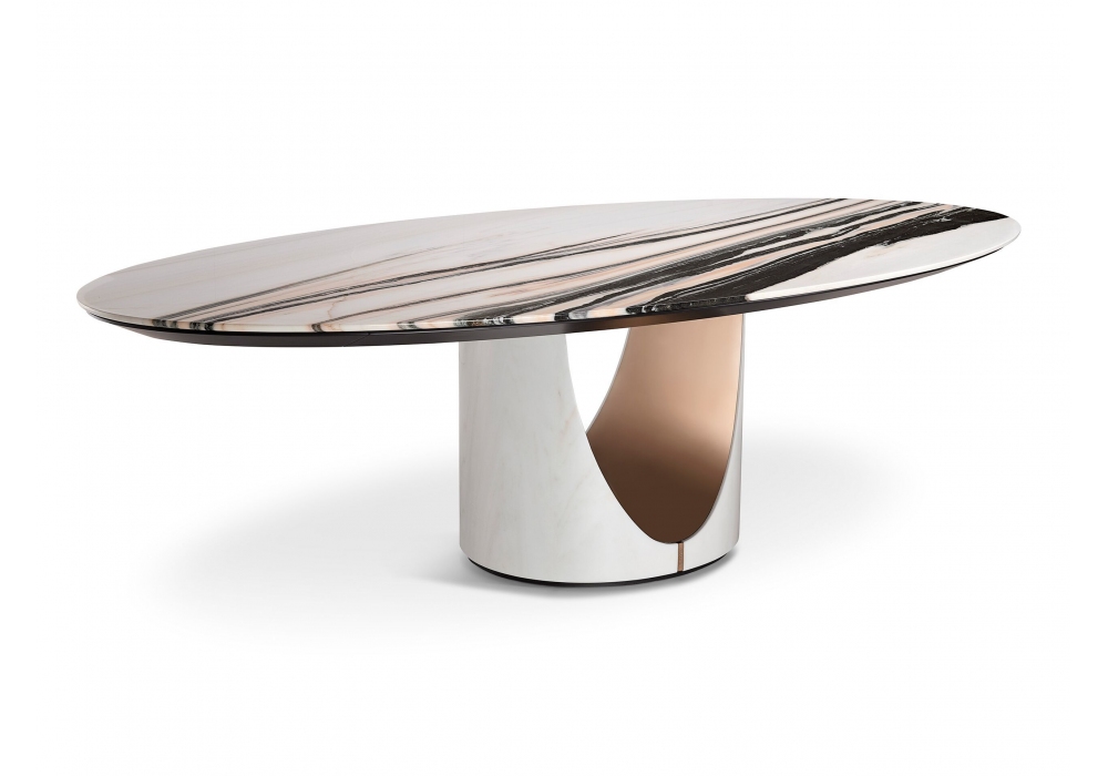 Cameron Marble von Alessandro La Spada für Visionnaire entworfen ist ein Tisch mit einer ovalen oder runden Platte aus Marmor und einem Untergestell aus Marmor und Stahl. Cameron Marble ist in verschiedenen Modellen erhältlich.