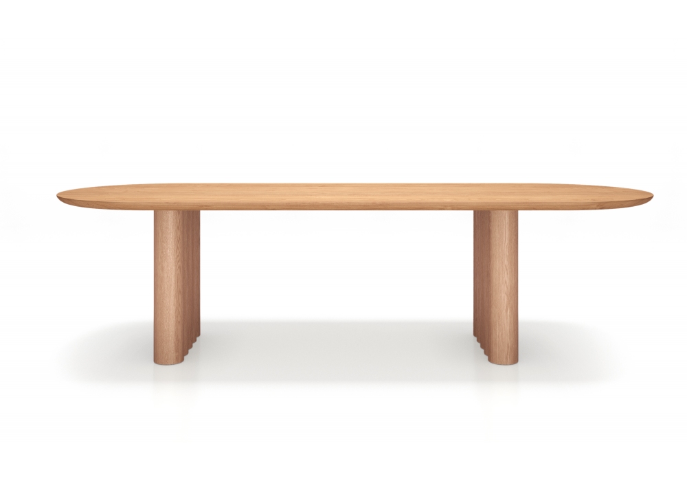 Plush von Jacob Plejdrup für Dk3 entworfen, ist ein ovaler Tisch aus Massivholz, der in verschiedenen Ausführungen und Größen erhältlich ist, auch mit Verlängerungen erhältlich.