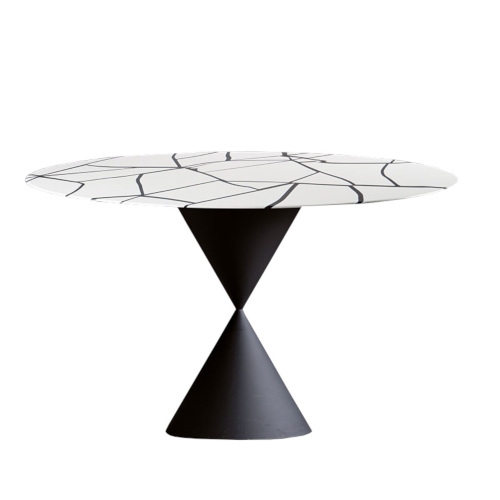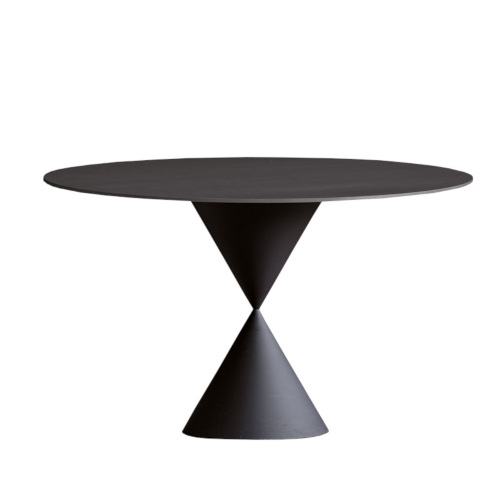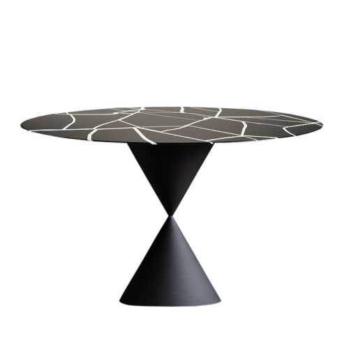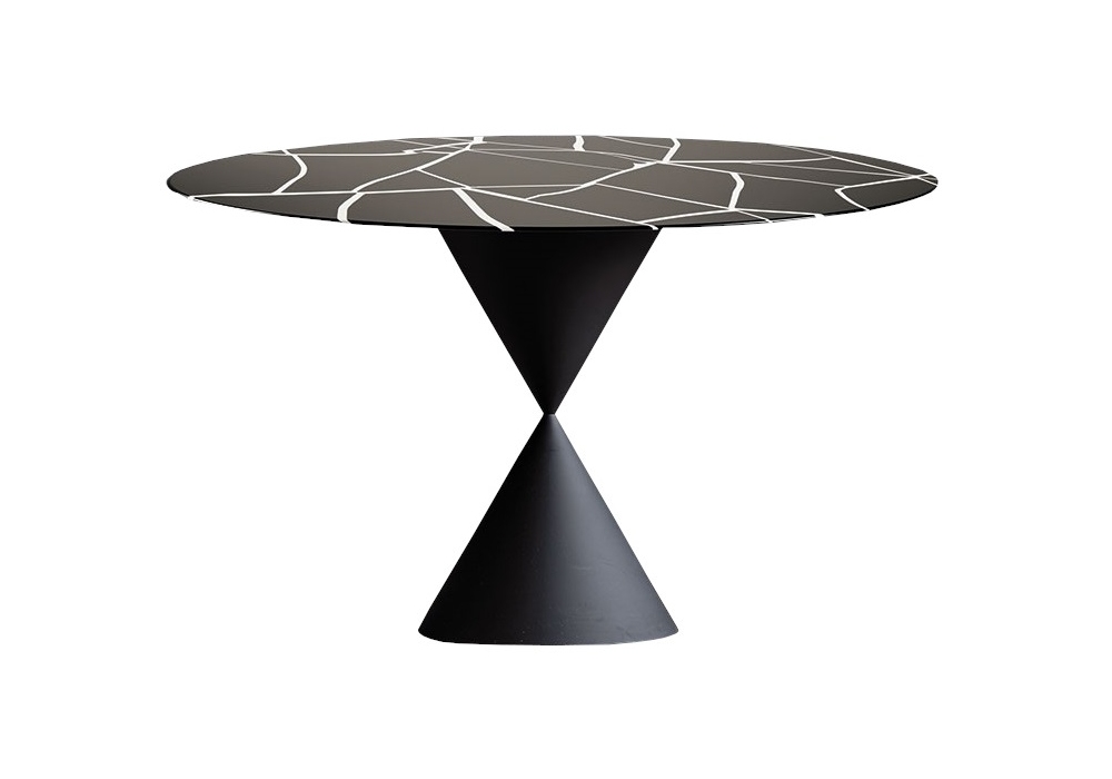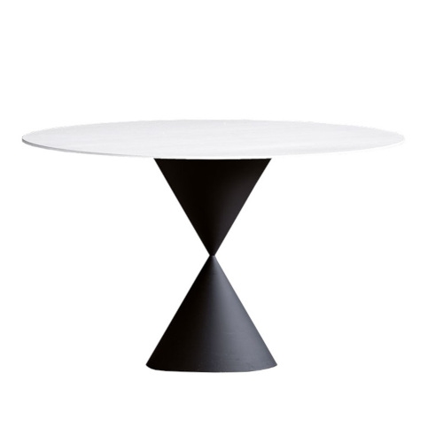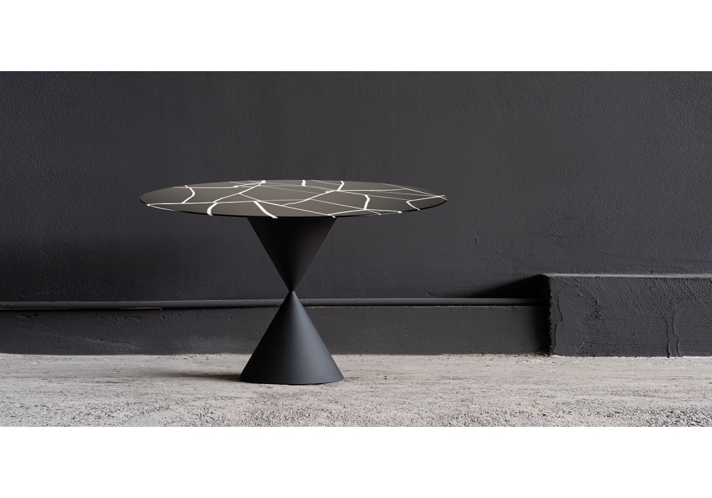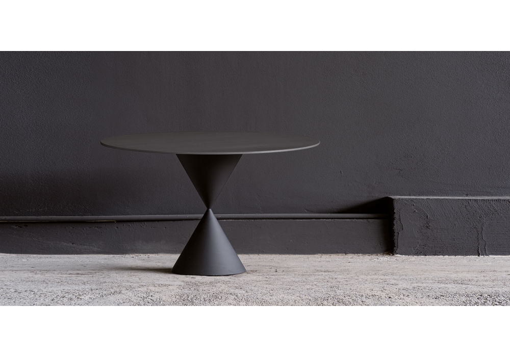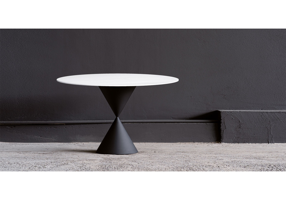 Con-Tato, von Walter De Silva für Codiceicona entworfen, ist ein runder Tisch mit Holz- oder Quarzplatte und schwarzen Stahlbeinen. Die Oberseite ist in verschiedenen Ausführungen erhältlich.