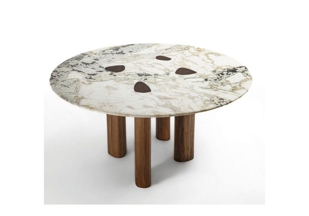 Oswood von Patrick Jouin für Porada entworfen, ist ein runder Esstisch mit Marmorplatte und Beinen aus massivem Canaletta-Walnussholz. Auf der Marmorplatte befinden sich Holzeinlagen in der gleichen Ausführung wie die Beine.