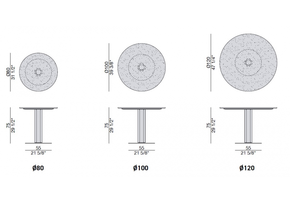 | Abmessungen | • Ø 80 x H 75 cm; • Ø 100 x H 75 cm; • Ø 120 x H 75 cm |