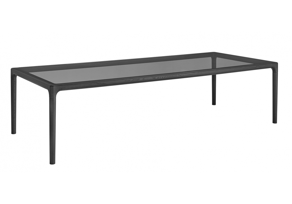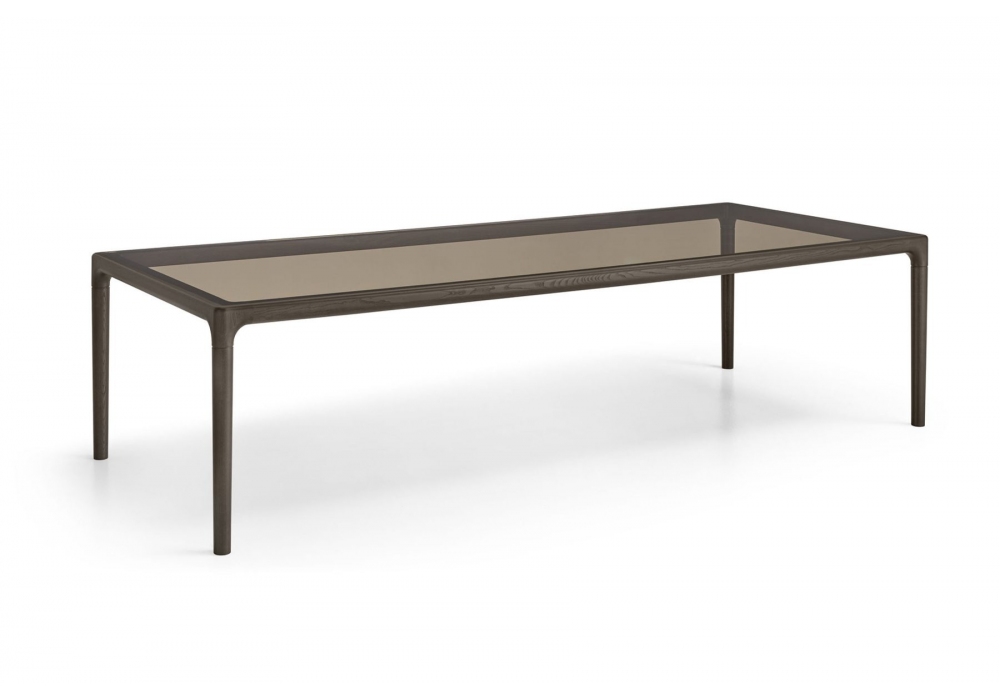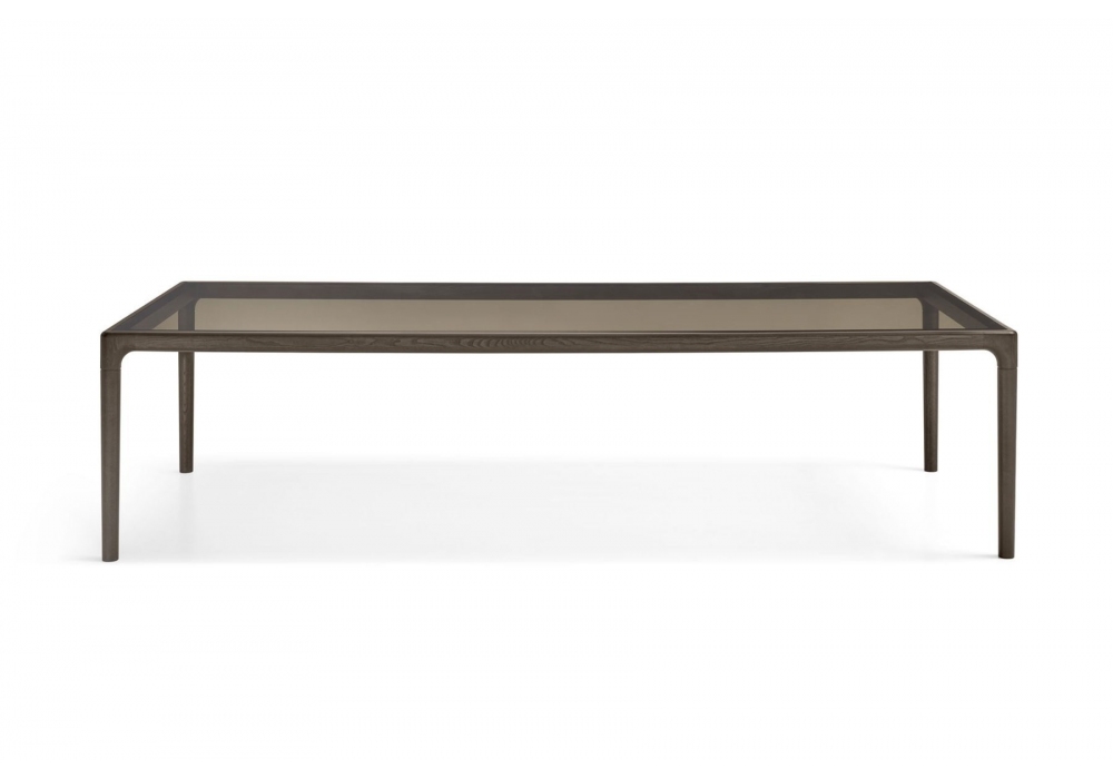 Vertige von Emmanuel Gallina für Fiam entworfen ist ein viereckiger Tisch mit einer tragenden Struktur aus lackiertem Massivholz. Die Platte besteht aus gehärtetem Glas mit Bronze-Finish für das Tabakmodell und Rauchglas für das schwarze wärmebehandelte Finish. Vertige ist in verschiedenen Ausführungen und Größen erhältlich.
