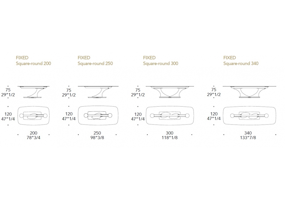 Abmessungen 200 x 120 x H 75 cm (1 base); 250 x 120 x H 75 cm (1 base); 300 x 120 x H 75 cm; 340 x 120 x H 75 cm.