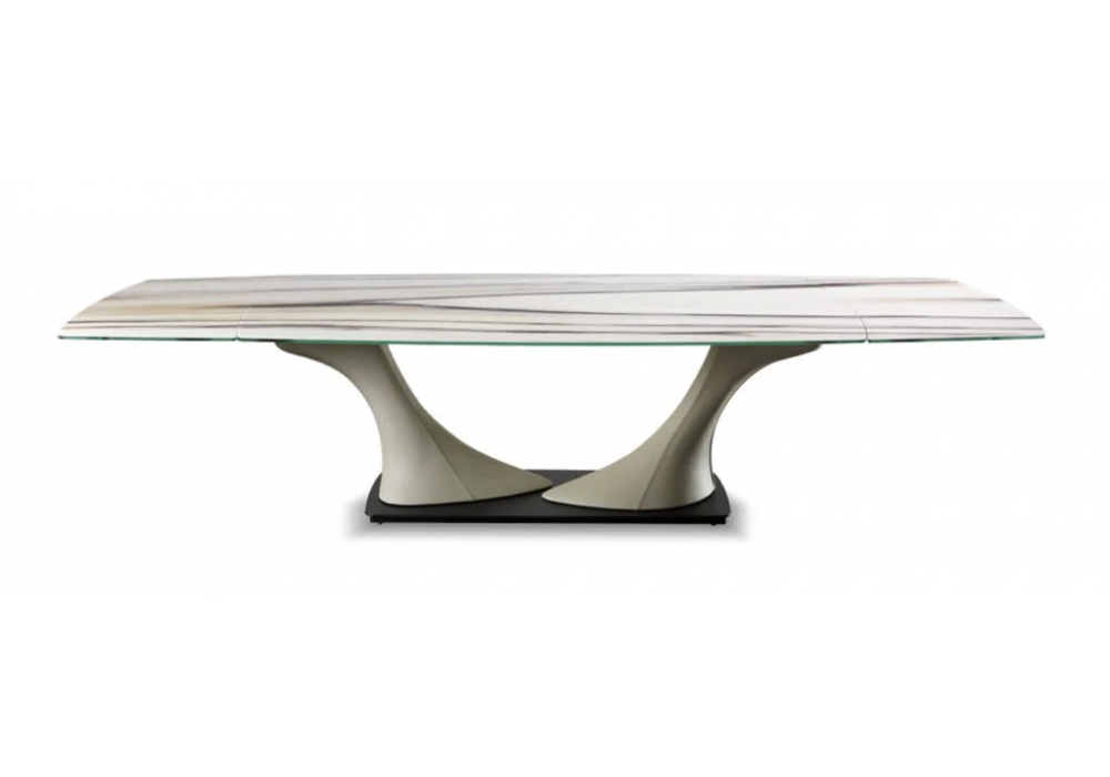 Archimede 72 von Riccardo Lucatello für Reflex Angelo entworfen, ist ein Ausziehbarer Tisch mit Metallstruktur und -platte, Beinen mit Lederbezug und Tischplatte aus Marmoreflex/Legnoreflex. Verfügbar in mehreren Ausführungen und Abmessungen.
