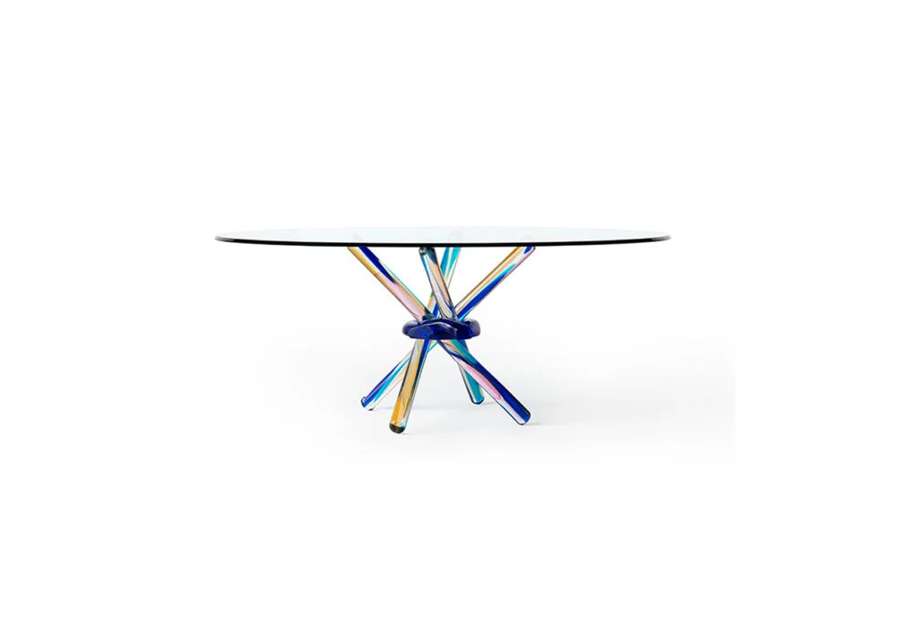 Arlequin 72 von Maurice Barilone für Reflex Angelo entworfen, ist ein Tisch mit einer Basis aus glattem Muranoglas mit einem Ring aus sandgestrahltem weißem Muranoglas oder Holz. Basis aus geripptem Muranoglas mit transparentem oder passendem geripptem Ring. DECO' Muranoglasbasis mit blauem Ring. Verfügbar in mehreren Ausführungen und Abmessungen.