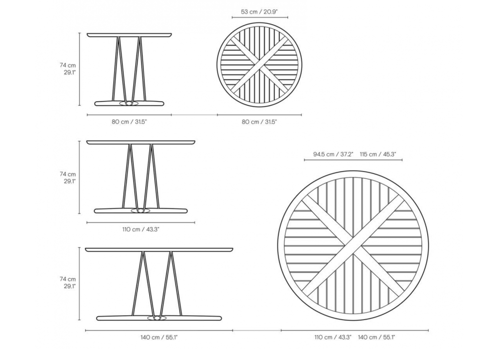 | Abmessungen | Ø 80 x H 74 cm; Ø 110 x H 74 cm; Ø 140 x H 74 cm. |