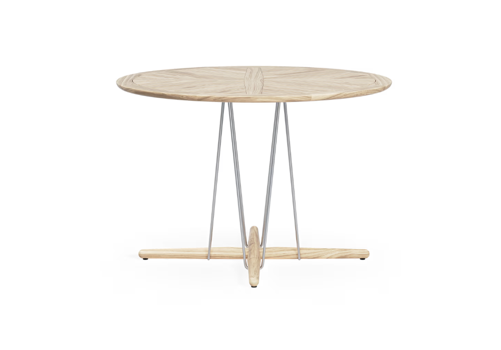 E022 Embrace von Eoos für Carl Hansen & Søn entworfen, ist ein Gartentisch mit Platte und Untergestell aus massivem, unbehandeltem Teakholz. Gestell aus Edelstahl. In verschiedenen Größen erhältlich.