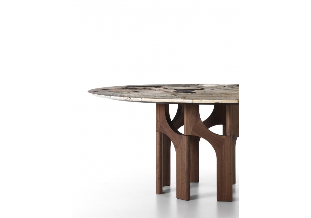 Augusto Matmor von D. Dolcini für Porada entworfen, ist ein Tisch mit einem modularen Untergestell aus massivem Canaletta-Walnussholz und einer Marmorplatte in verschiedenen Ausführungen.