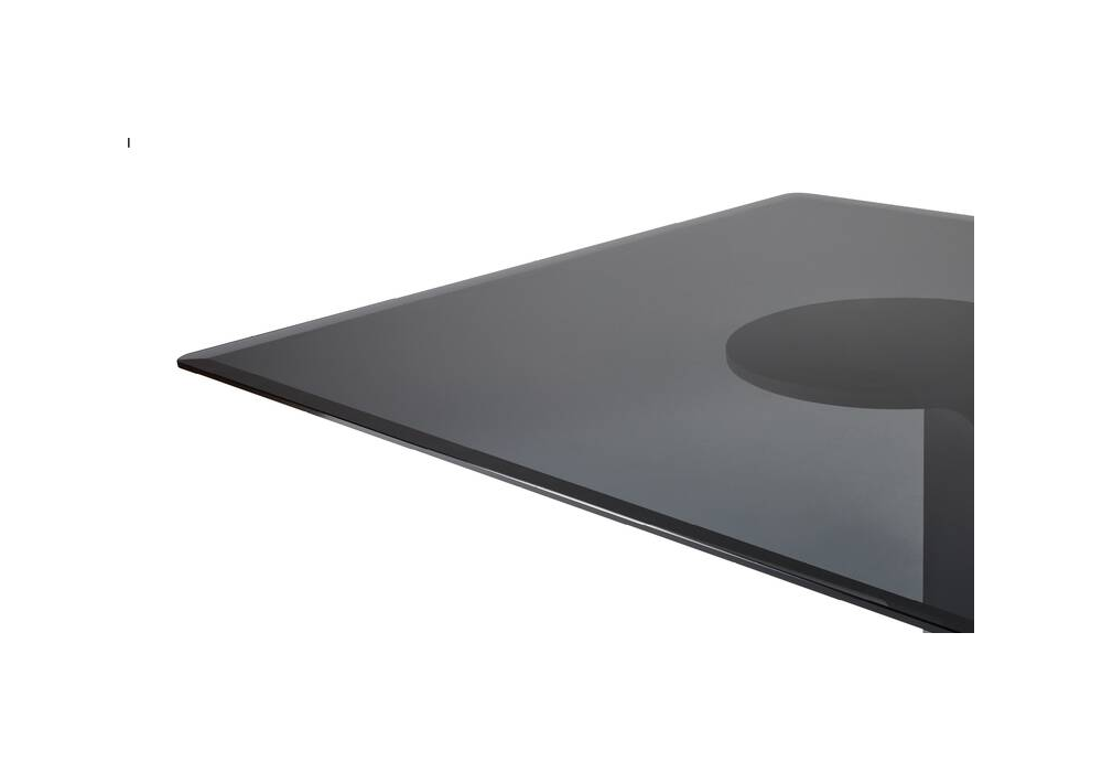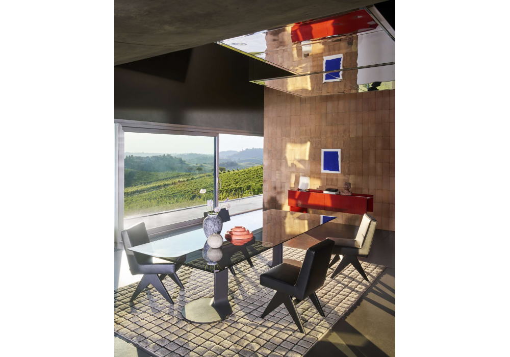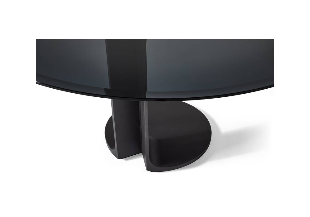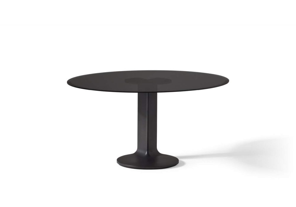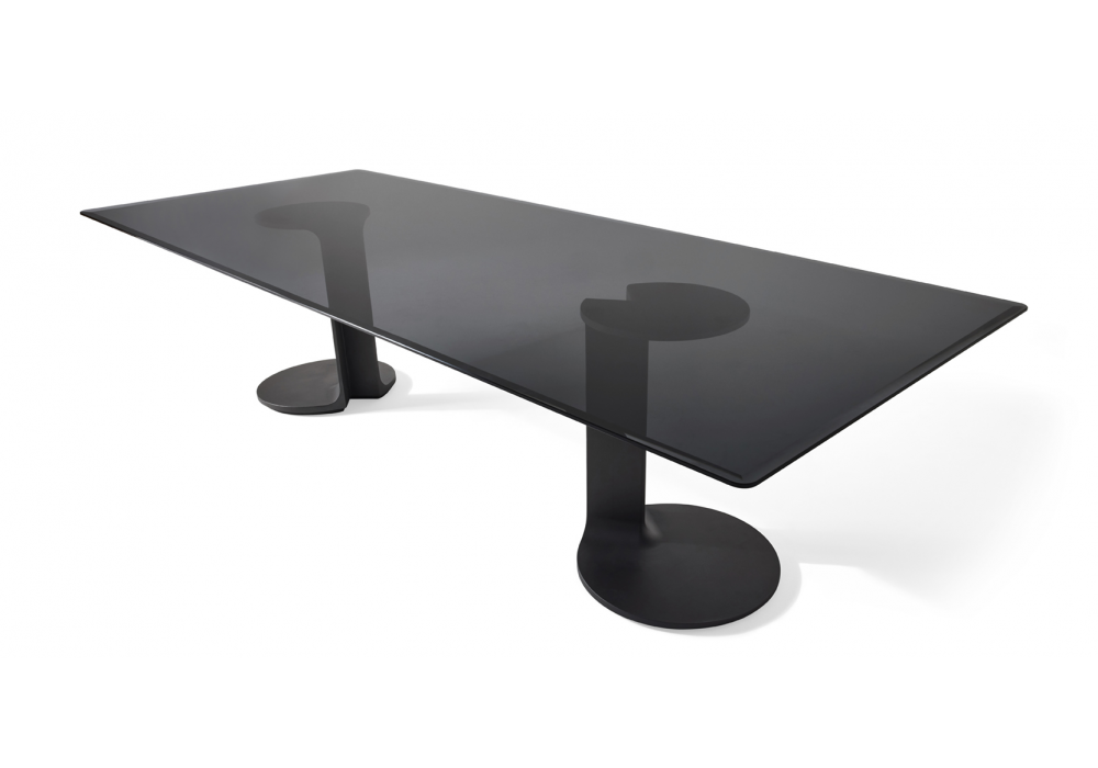 TL59 von Afra & Tobia Scarpa für Cassina entworfen, ist ein Tisch mit einer zentralen Basis aus geprägtem, schwarz lackiertem Aluminium und einer Glasplatte.