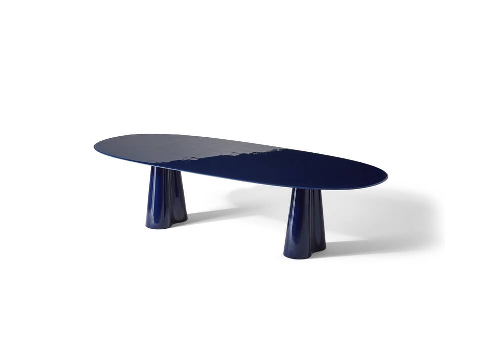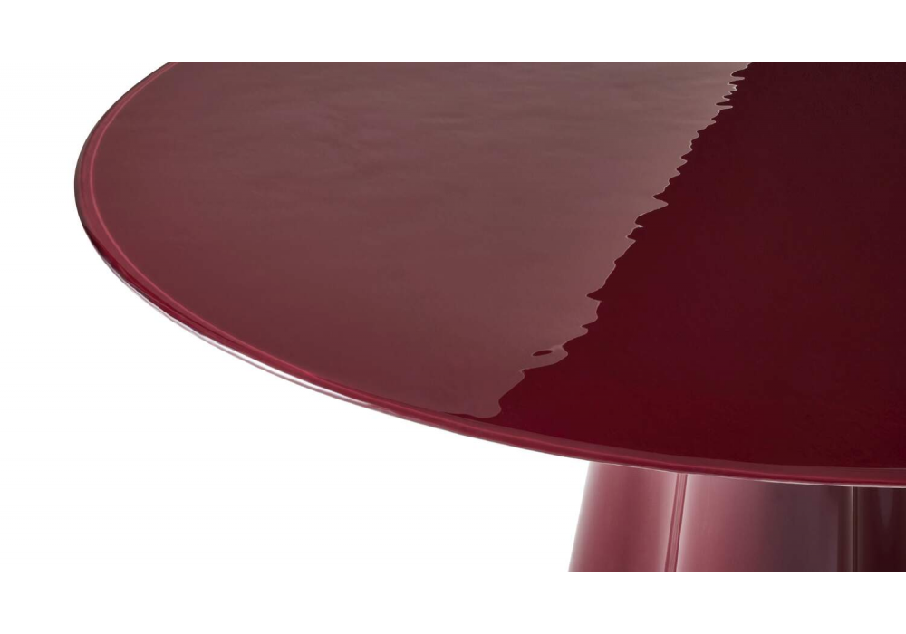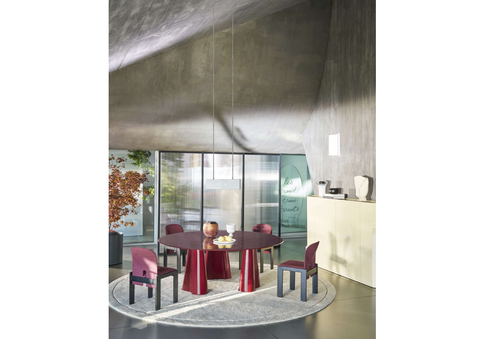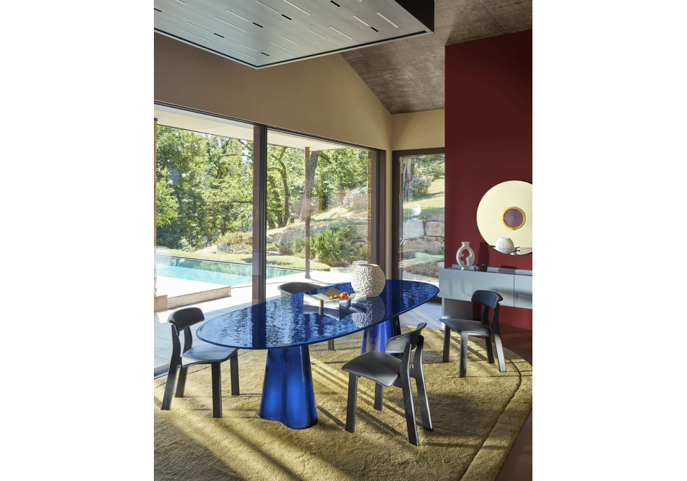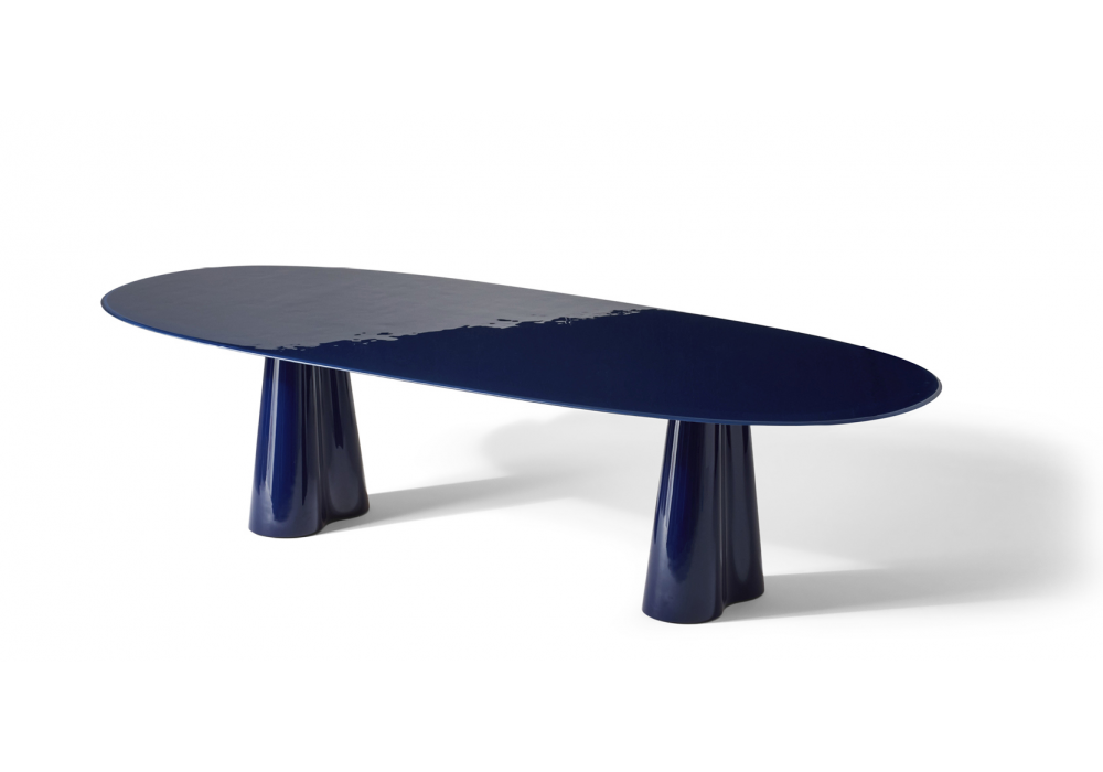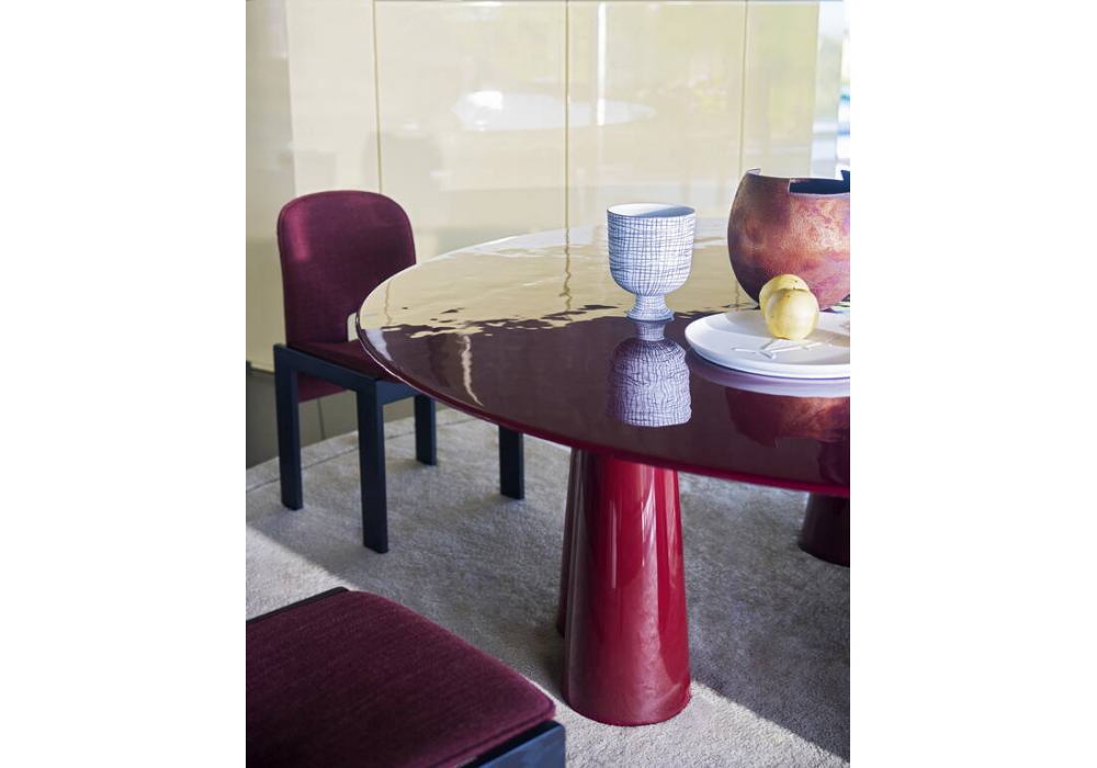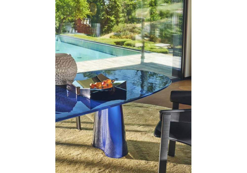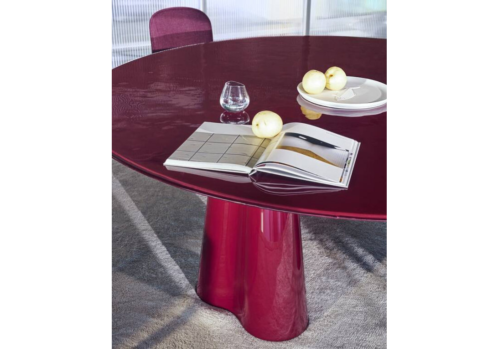 Treflo von Ronan Bouroullec für Cassina entworfen, ist ein Tisch mit einem glänzend lackierten Untergestell und einer rückseitig lackierten, gewellten Glasplatte oder ganz matt oder glänzend lackiert.