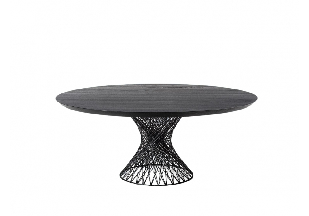 Web von Authentic Design für Riva 1920 entworfen, ist ein Tisch mit einer runden Platte aus Massivholz mit verleimten Latten kombiniert mit einem Untergestell aus gewebter Kohlefaser. Erhältlich in verschiedenen Ausführungen und Größen.