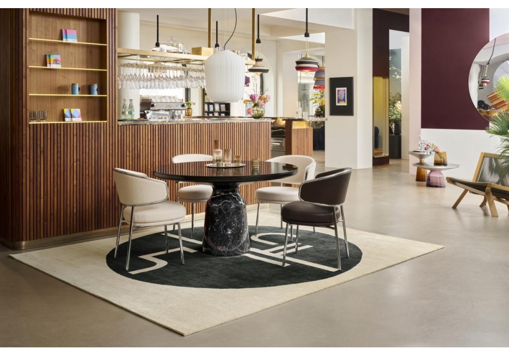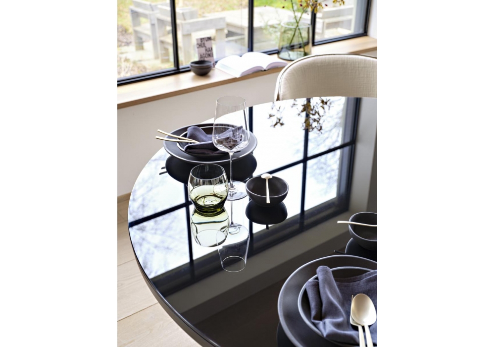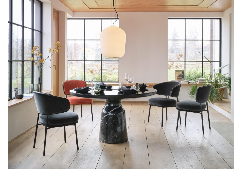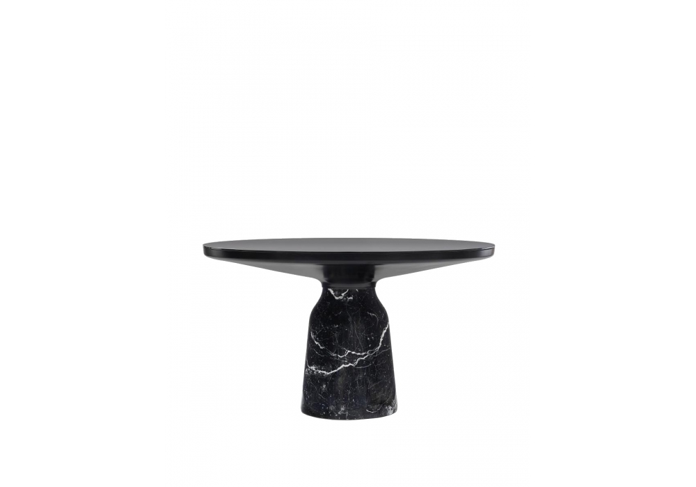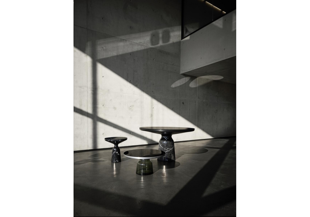 Bell Dining Table von Sebastian Herkner für ClassiCon entworfen, ist ein Tisch mit einem Untergestell aus poliertem und metallimprägniertem Nero Marquina Marmor und einer massiven, schwarz lackierten Stahlplatte. Alternativ gibt es ein Untergestell aus poliertem und metallimprägniertem Verde Guatemala Marmor und einer transparent lackierten Messingplatte. Tischplatte aus schwarz lackiertem Glas.