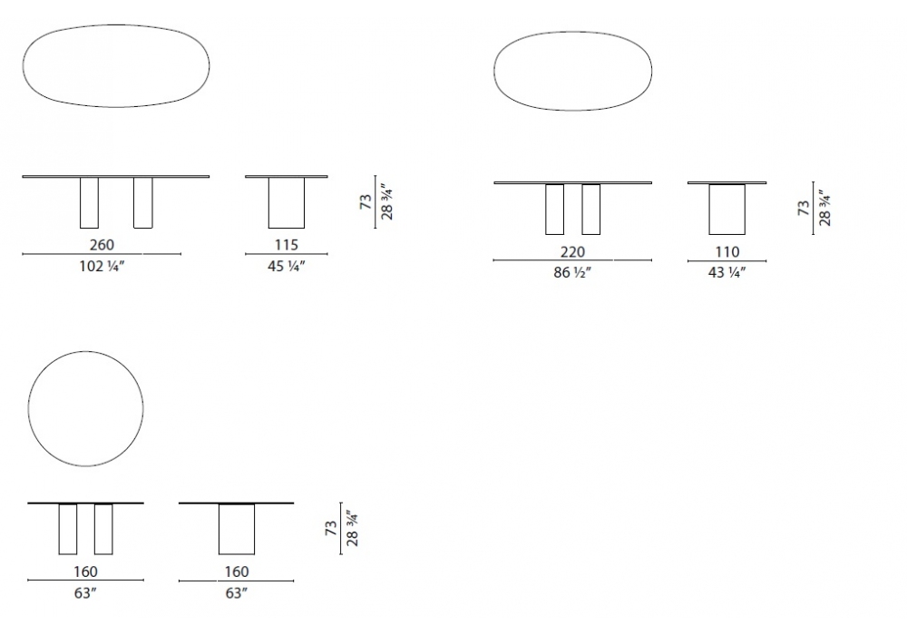 | Abmessungen | 260 x 115 x H 73 cm; 220 x 110 x H 73 cm; Ø 160 x H 73 cm. |
