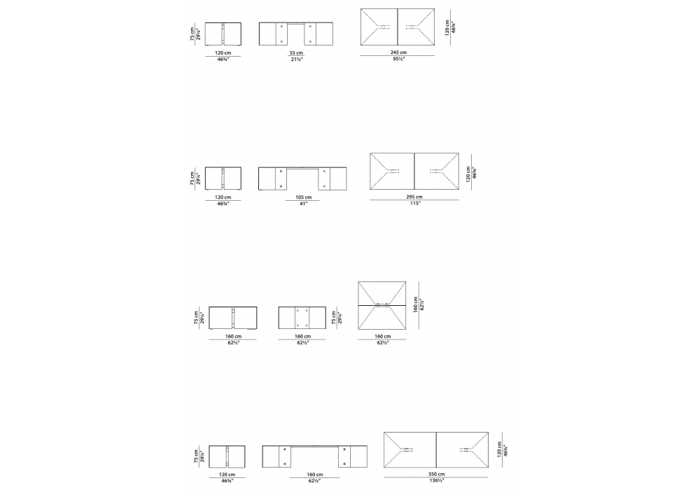 | Abmessungen | 245 x 120 x H 75 cm; 295 x 120 x H 75 cm; 160 x 160 x H 75 cm; 350 x 120 x H 75 cm. |