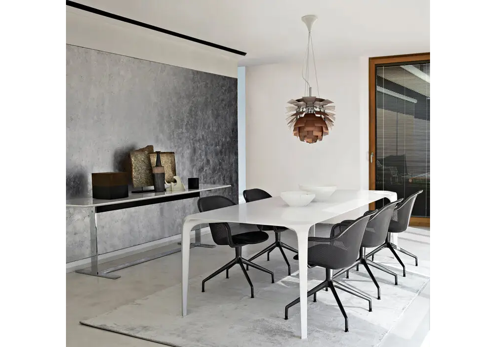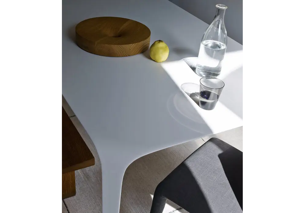 Link, von Jakob Wagner für B&B italia entworfen, ist ein Tisch aus Tischplatte und Beinen aus weißem Cristalplant Outdoor®. In zwei Dimensionen erhältlich.